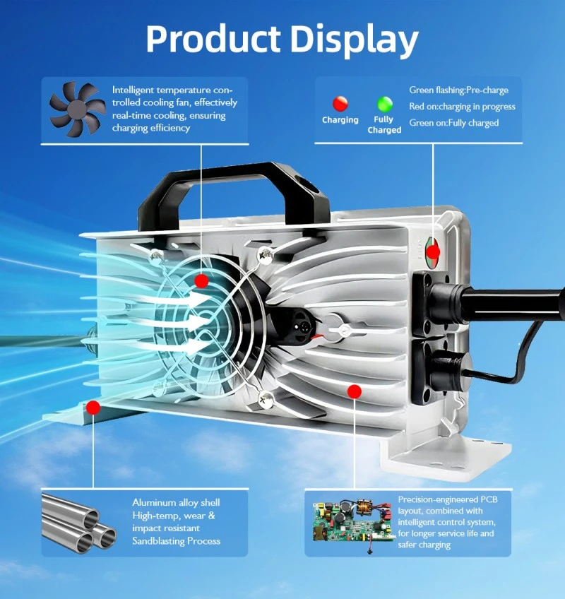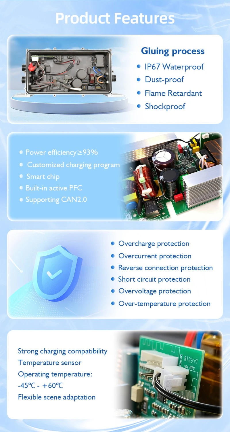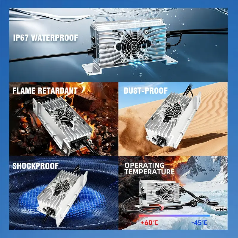 पूर्ण ॲल्युमिनियम मिश्र धातुचे शेल प्लॅस्टिक शेलच्या तुलनेत 35% ने उष्णता नष्ट करण्याची कार्यक्षमता वाढवते, सतत 1.2kW ऑपरेशन दरम्यान चार्जरचे ऑपरेटिंग तापमान 60℃ खाली ठेवते, अशा प्रकारे अंतर्गत घटकांचे संरक्षण करते आणि सेवा आयुष्य वाढवते. याव्यतिरिक्त, हे बहु-स्तर सुरक्षा संरक्षण यंत्रणेसह सुसज्ज आहे, ज्यात ओव्हर-व्होल्टेज संरक्षण (55V कमाल), अति-वर्तमान संरक्षण (28A कमाल), शॉर्ट-सर्किट संरक्षण आणि अति-तापमान संरक्षण, चार्जर आणि बॅटरीचे नुकसान प्रभावीपणे प्रतिबंधित करते आणि सर्व ऑन-बोर्ड वातावरणात सुरक्षित ऑपरेशन सुनिश्चित करते.