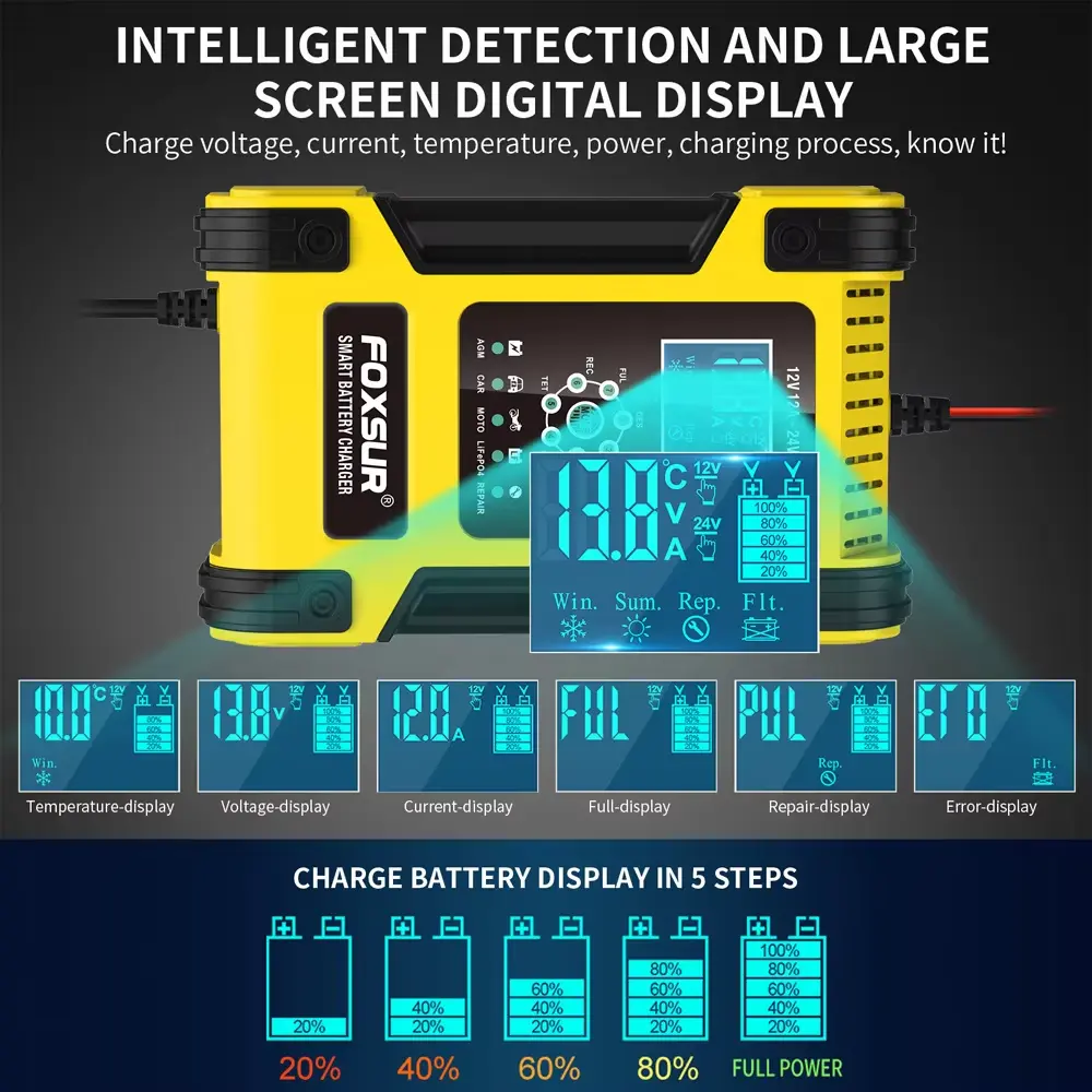 आमची 7-स्टेज इंटेलिजेंट चार्जिंग सिस्टम बॅटरीचे आयुष्य वाढवण्यासाठी आणि कार्यप्रदर्शन सुधारण्यासाठी डिझाइन केलेली आहे. अनेक स्पर्धकांच्या विपरीत, हा चार्जर प्रत्येक बॅटरी प्रकारासाठी अनुकूल चार्जिंग सायकल ऑफर करतो, जास्तीत जास्त कार्यक्षमता आणि विश्वासार्हता.