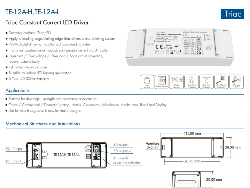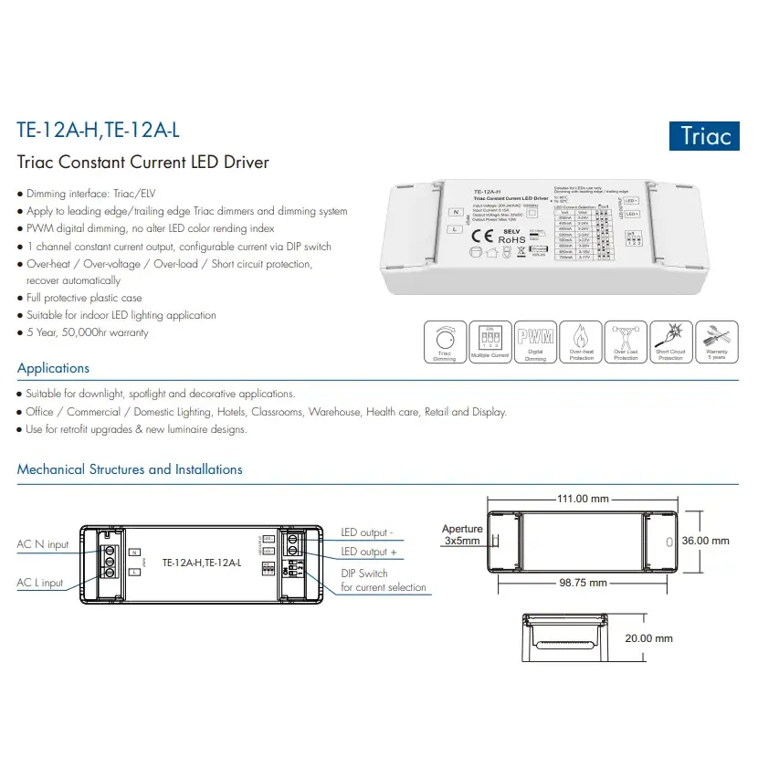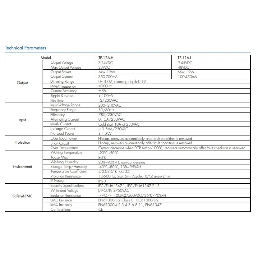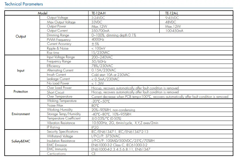 इनपुट व्होल्टेज: 200-240VAC 50-60Hz इनपुट वर्तमान:0.15A आउटपुट पॉवर: १२ वॅट्स कमाल आउटपुट व्होल्टेज: 9~42V वॉरंटी: २ वर्षे प्रमाणपत्र:CE/Rohs