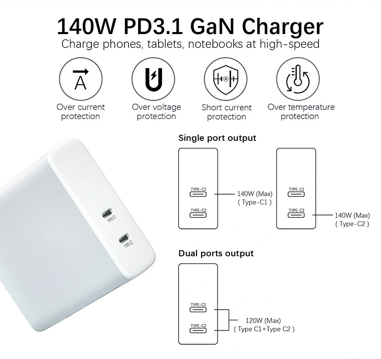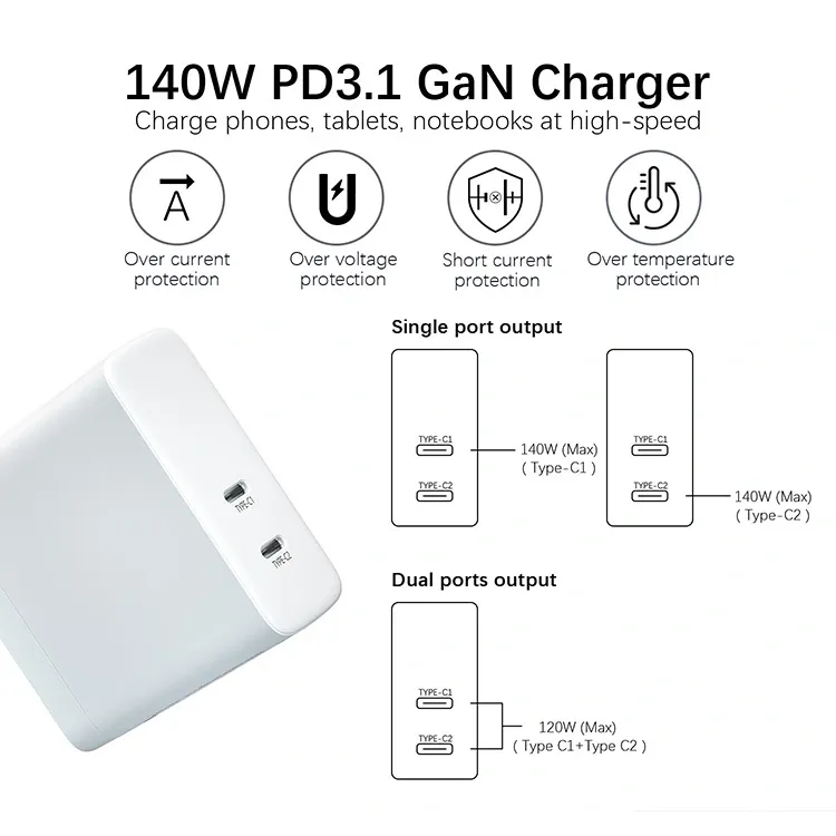 140W ड्युअल usb c पोर्ट PD चार्जर US प्लग फोल्ड करण्यायोग्य: सिंगल पोर्ट 140W पर्यंत पॉवर प्रदान करू शकतो. ड्युअल पोर्ट आउटपुट पॉवर बुद्धिमानपणे एकाच वेळी वाटप केले जाते. लॅपटॉप आणि मोबाईल फोन एकाच वेळी चार्ज करताना, कार्यक्षमता अपरिवर्तित राहते.