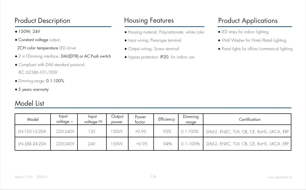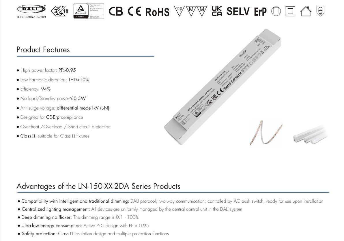 150W 24V DALI CCT कॉन्स्टंट व्होल्टेज LED ड्रायव्हर |