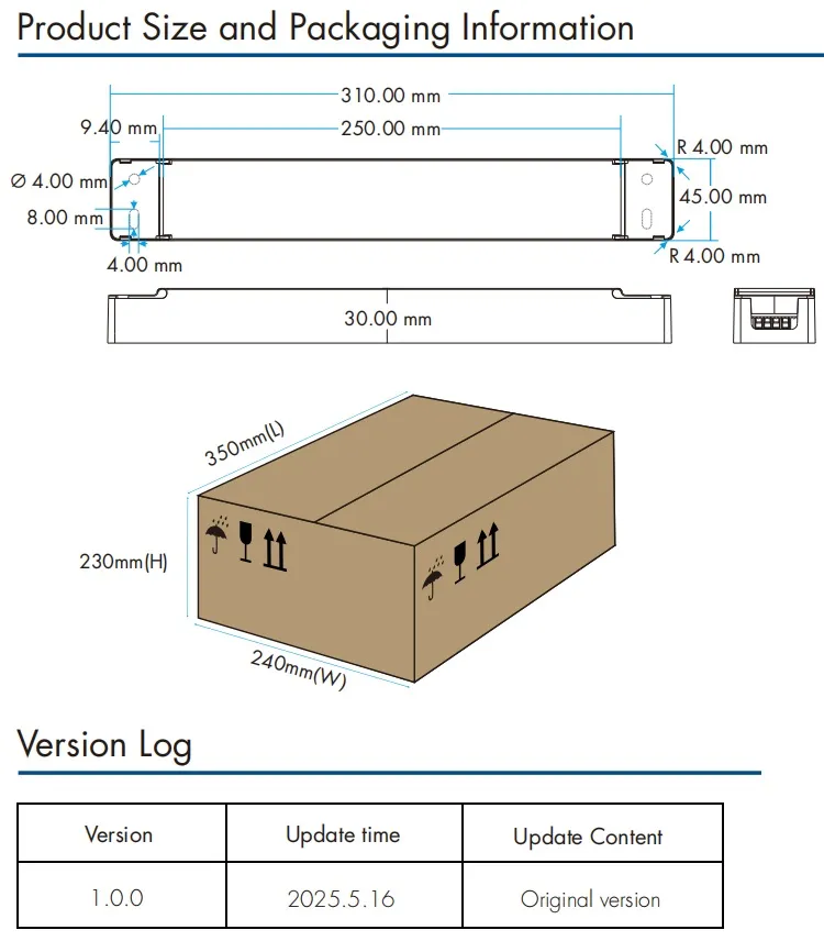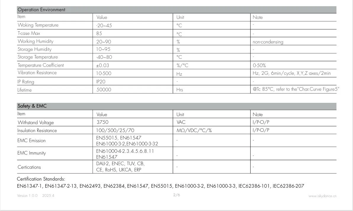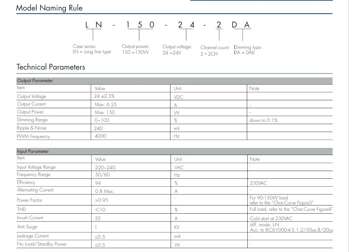 मंद करणारा इंटरफेस 0/1-10V डिमिंग: डिमिंग रेंज 0-10V किंवा 1-10V, डिमिंग कनेक्टर वर्तमान वापर ≤ 0.3 mA, मंद वक्र "Char.curve आकृती 6-7" चा संदर्भ घ्या. CCT वक्र "चार. वक्र आकृती 8" चा संदर्भ देते. पुश स्विच डिमिंग: व्होल्टेज श्रेणी 220~240VAC 50/60Hz.