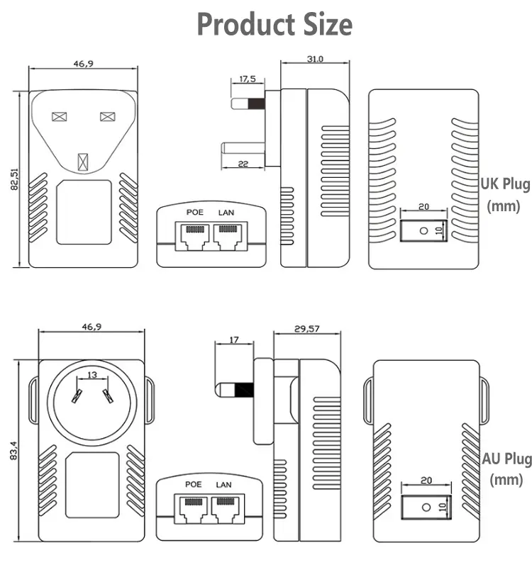 कॉम्पॅक्ट वॉल-प्लग स्ट्रक्चर स्टँडर्ड पॉवर सॉकेट्ससह थेट वापर करण्यास अनुमती देते, कोणत्याही अतिरिक्त कंस किंवा वायरिंगची आवश्यकता नाही. हा 24V 1A 48V 0.5A POE इंजेक्टर जागा वाचवतो आणि केबल टाकणे सोपे करतो, ज्यामुळे ते घर, कार्यालय, दुकान आणि लहान पाळत ठेवणे प्रणालींसाठी एक आदर्श पर्याय बनते.