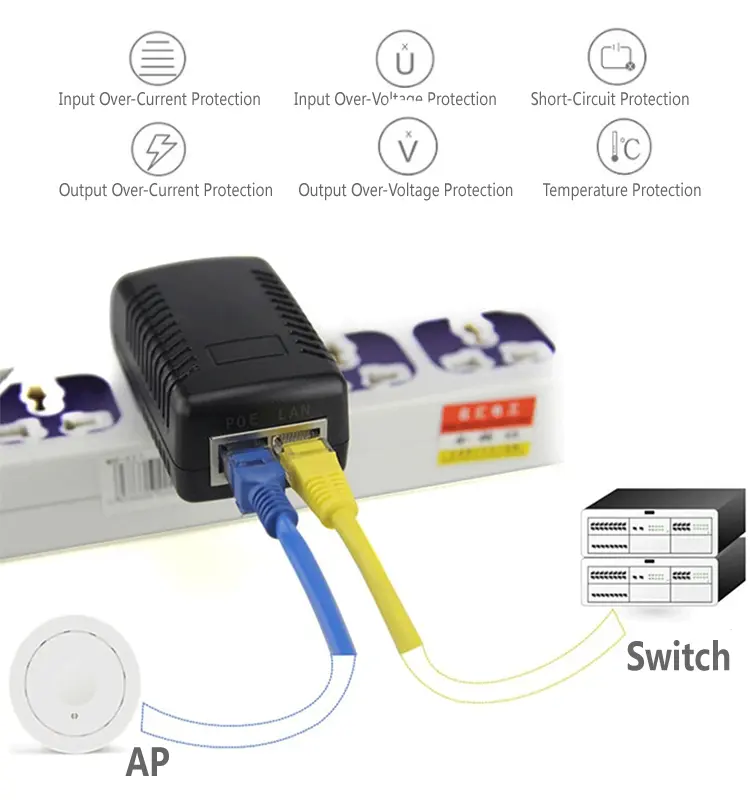 2 पोर्ट POE इंजेक्टर स्थिर व्होल्टेज आणि प्रवाह कमी रिपलसह वितरित करतो, दीर्घकालीन स्थिर ऑपरेशन सुनिश्चित करतो. वाइड इनपुट व्होल्टेज 100–240VAC ग्लोबल पॉवर ग्रिड्सशी जुळवून घेते. अंगभूत ओव्हर-व्होल्टेज, ओव्हर-करंट, शॉर्ट-सर्किट आणि अति-तापमान संरक्षण ड्युअल पोर्ट POE इंजेक्टर आणि कनेक्ट केलेले उपकरण दोन्ही सुरक्षित करते.