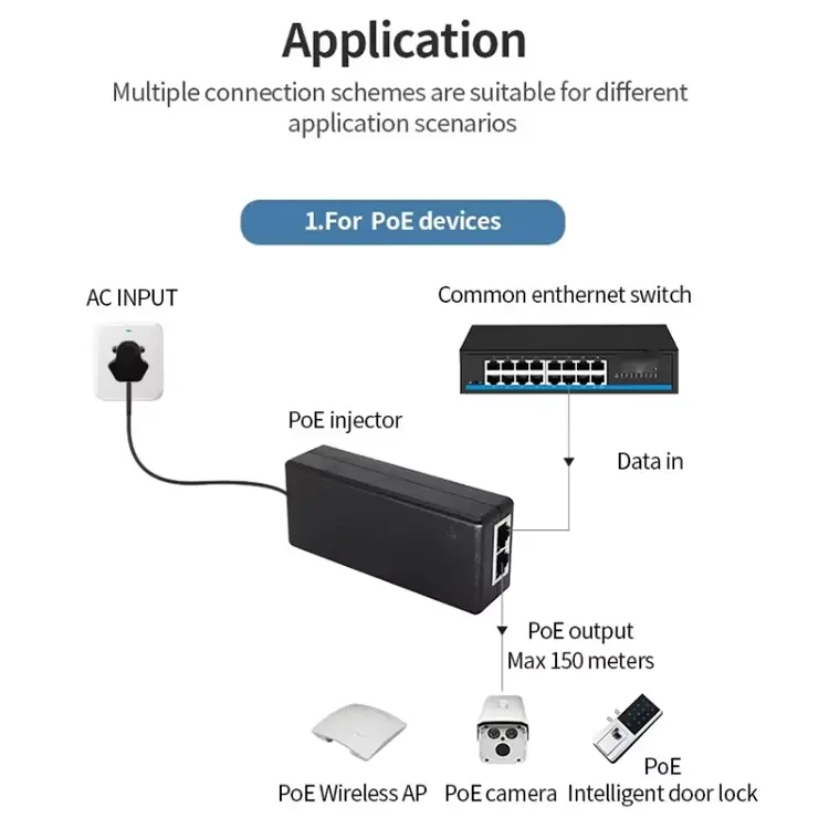 हे निष्क्रिय PoE इंजेक्टर प्रोटोकॉल हँडशेकशिवाय थेट पॉवर ट्रान्समिशन वापरते, सिस्टमची जटिलता कमी करते आणि विशिष्ट नेटवर्किंग उपकरणांसह सुसंगतता सुधारते.