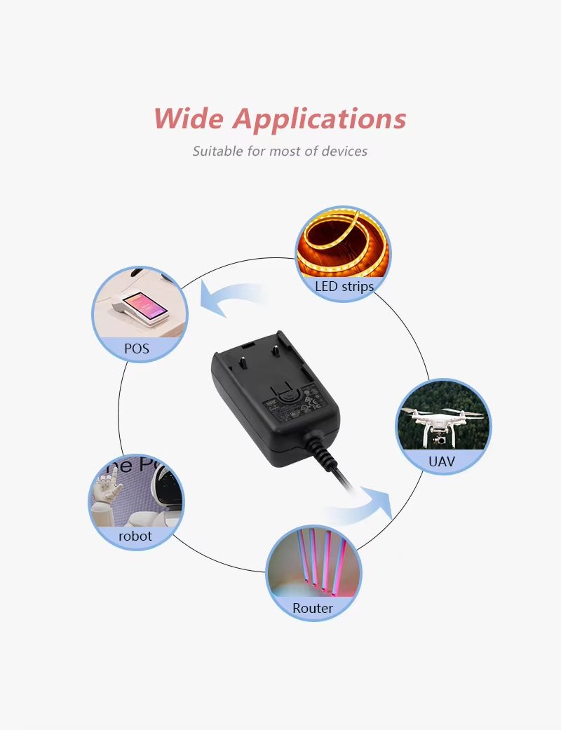 ॲप्लिकेशन परिस्थितीची विस्तृत श्रेणी: LED लाइट स्ट्रिप्स, स्मार्ट स्पीकर, नेटवर्क राउटर किंवा इतर लहान इलेक्ट्रिकल उपकरणे पॉवरिंगसाठी असोत, हे शक्तिशाली स्विचिंग इंटरचेंज करण्यायोग्य प्लग पॉवर सप्लाय ही तुमची सर्वात आदर्श आणि आश्वासक निवड आहे!