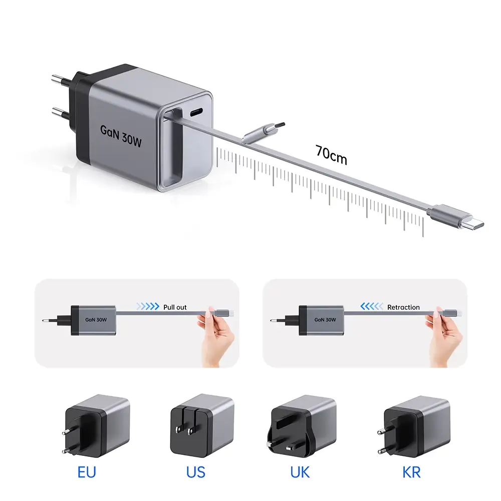 मागे घेण्यायोग्य प्रकार सी केबल वैशिष्ट्यांसह 30W क्विक चार्जर: