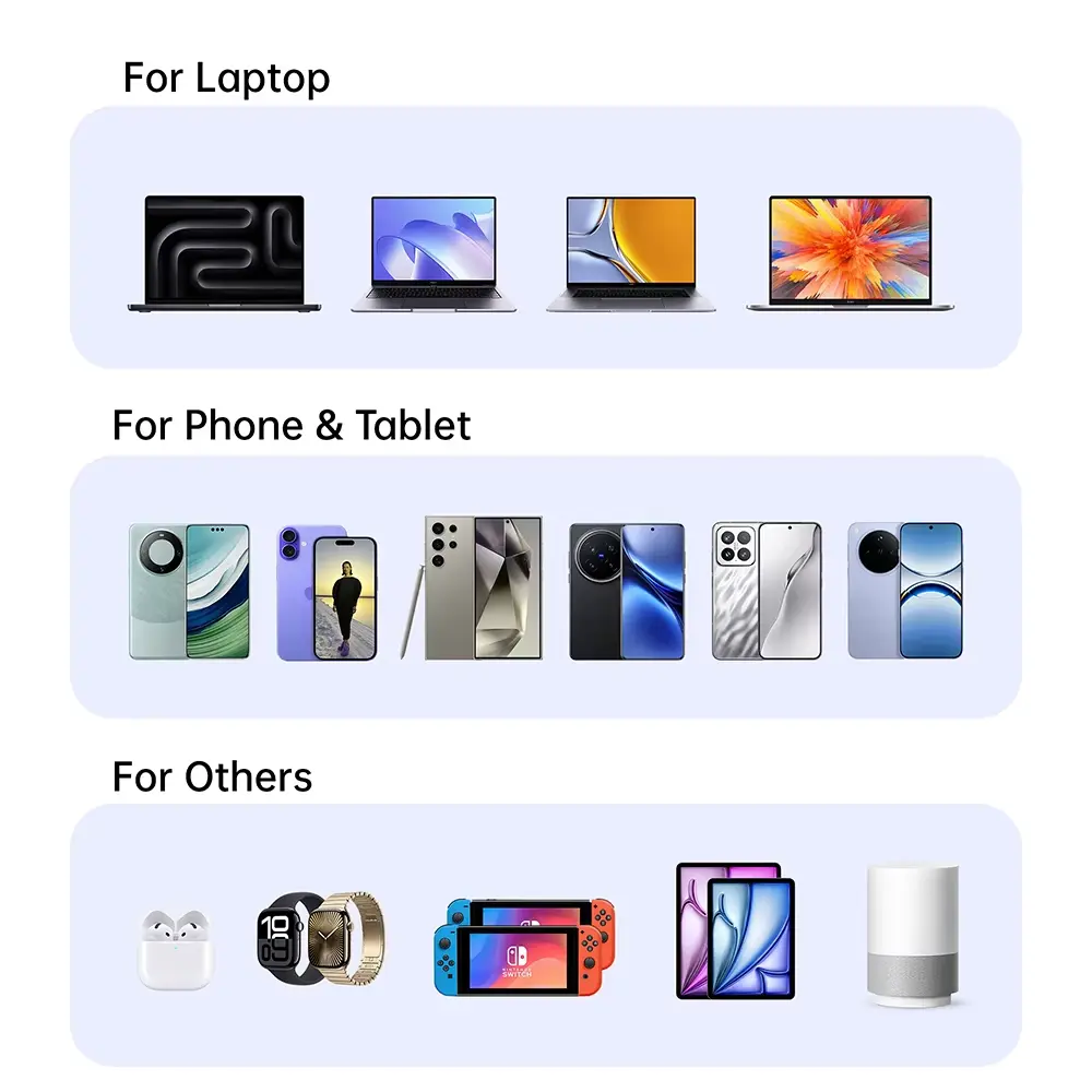 मोबाइल फोन, हेडफोन आणि गेमिंग ॲक्सेसरीजसह USB-C डिव्हाइसेससह सुसंगत. सुरक्षित आणि कार्यक्षम चार्जिंगसाठी डिव्हाइसच्या गरजा स्वयंचलितपणे शोधते. 4.प्रवास-तयार पोर्टेबिलिटी
