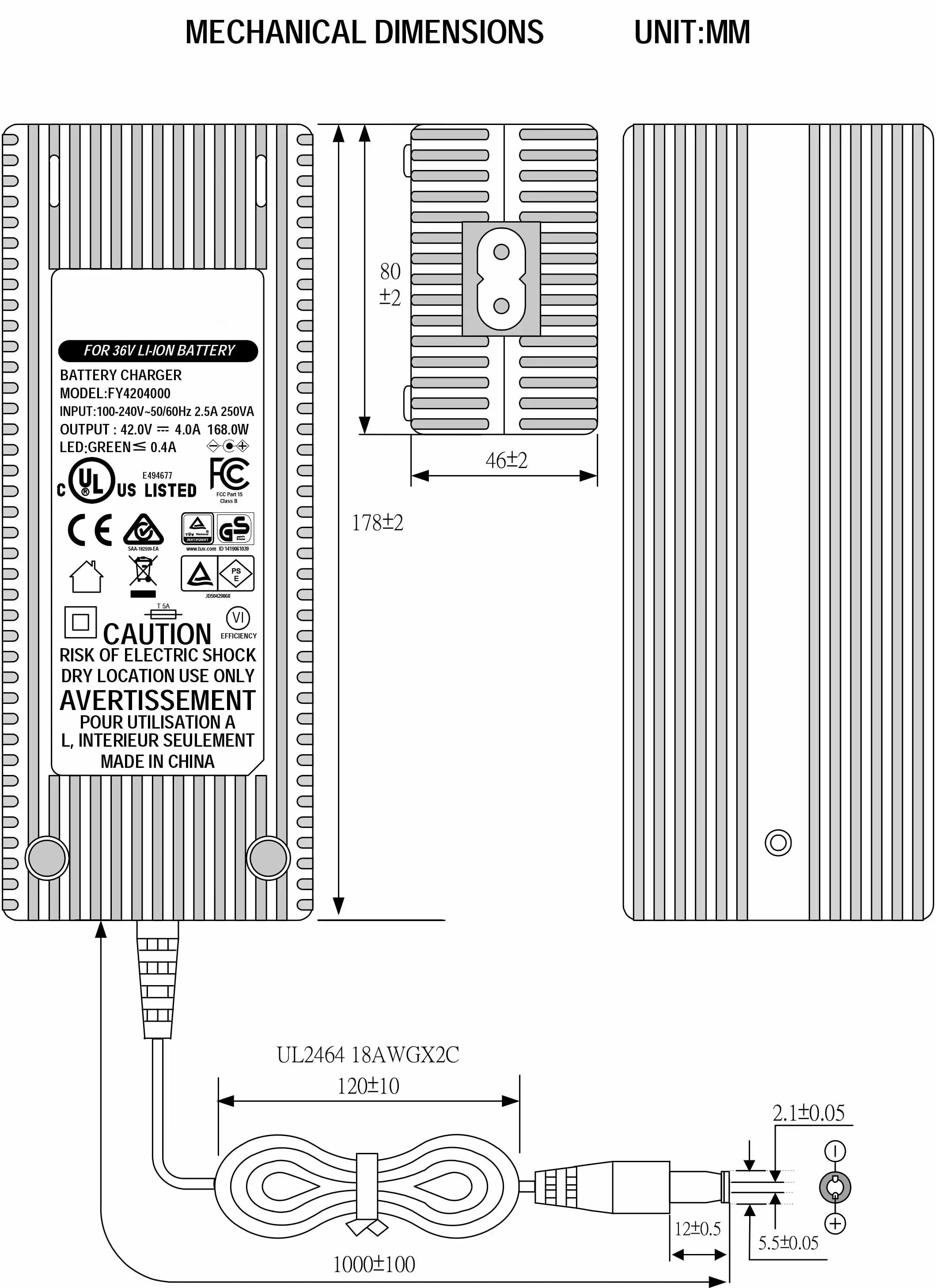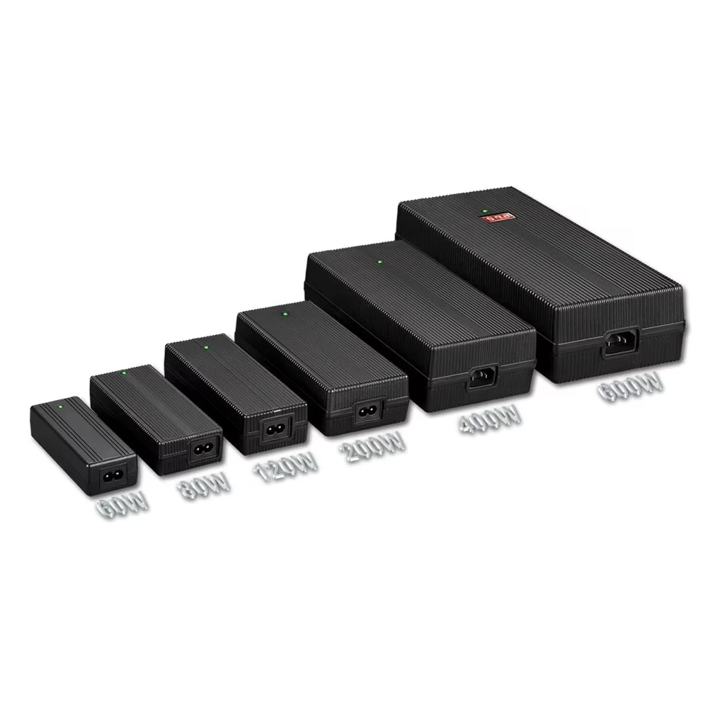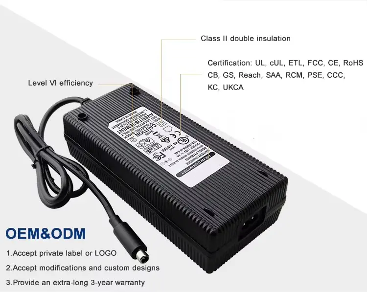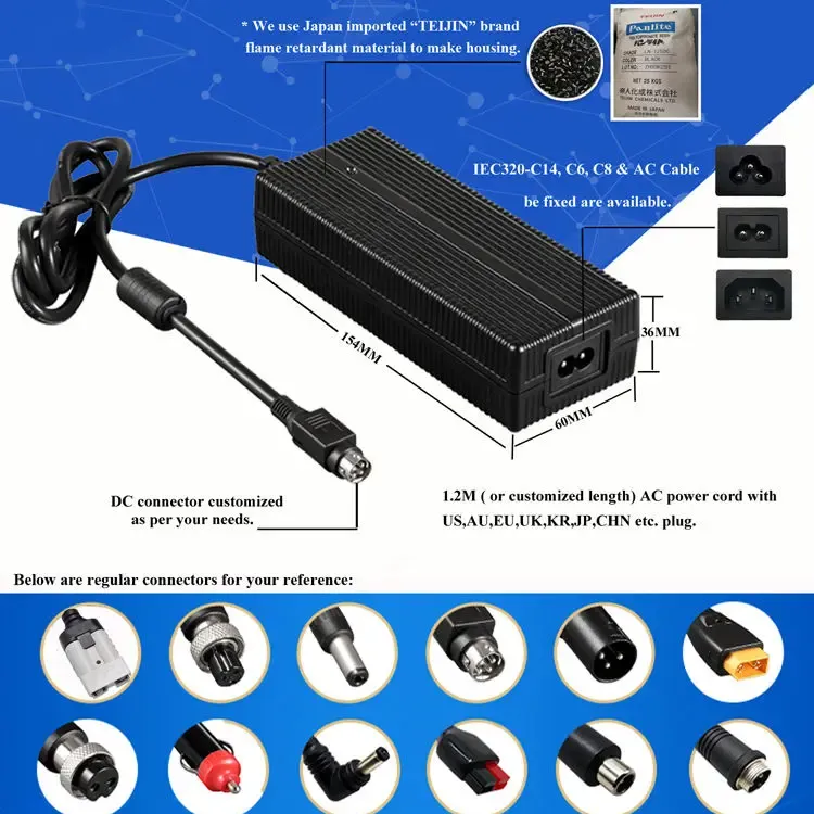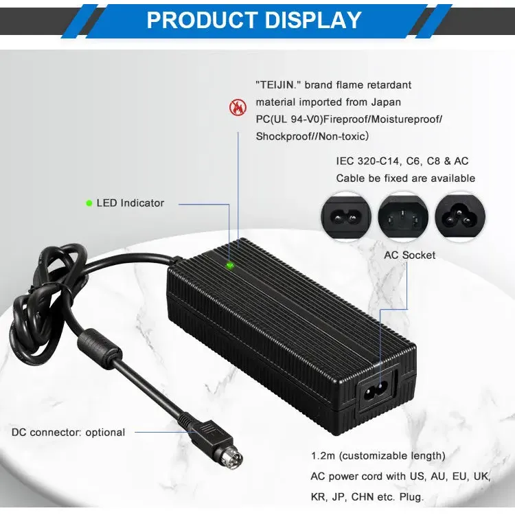 जागतिक सुसंगतता आणि लवचिक डिझाइन: 100-240VAC, 50/60Hz च्या सार्वत्रिक AC इनपुट श्रेणीसह तयार केलेला, हा चार्जर जगभरात वापरण्यास सपोर्ट करतो. हे एकाधिक AC इनलेट पर्याय (IEC320-C14, C6, C8) ऑफर करते आणि 1.2M पॉवर कॉर्डसह येते जी यूएस, AU, EU, UK, KR, JP, CHN आणि इतर प्रादेशिक प्लगसह सानुकूलित केली जाऊ शकते. विविध ऑपरेटिंग परिस्थितींमध्ये टिकाऊपणा आणि सुरक्षितता सुनिश्चित करून, PC अग्निरोधक सामग्रीपासून घरांचे बांधकाम केले जाते.