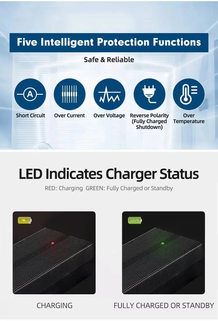 इंटेलिजेंट थ्री-स्टेज चार्जिंग (CC/CV/Trickle) सह सुसज्ज, हे ओव्हरचार्जिंग, ओव्हरहाटिंग आणि शॉर्ट सर्किट्स रोखून बॅटरीचे उत्तम आरोग्य सुनिश्चित करते. टिकाऊ ॲल्युमिनियम धातूंचे घर सुरक्षित, दीर्घकालीन वापरासाठी उत्कृष्ट उष्णता नष्ट करते. मानक 3-प्रॉन्ग XLR कनेक्टरसह, हे चार्जर विश्वसनीय, कार्यक्षम पॉवर डिलिव्हरी देते, ज्यामुळे ते तुमच्या इलेक्ट्रिक मोबिलिटी उपकरणांसाठी एक आदर्श बदली किंवा अपग्रेड बनते.