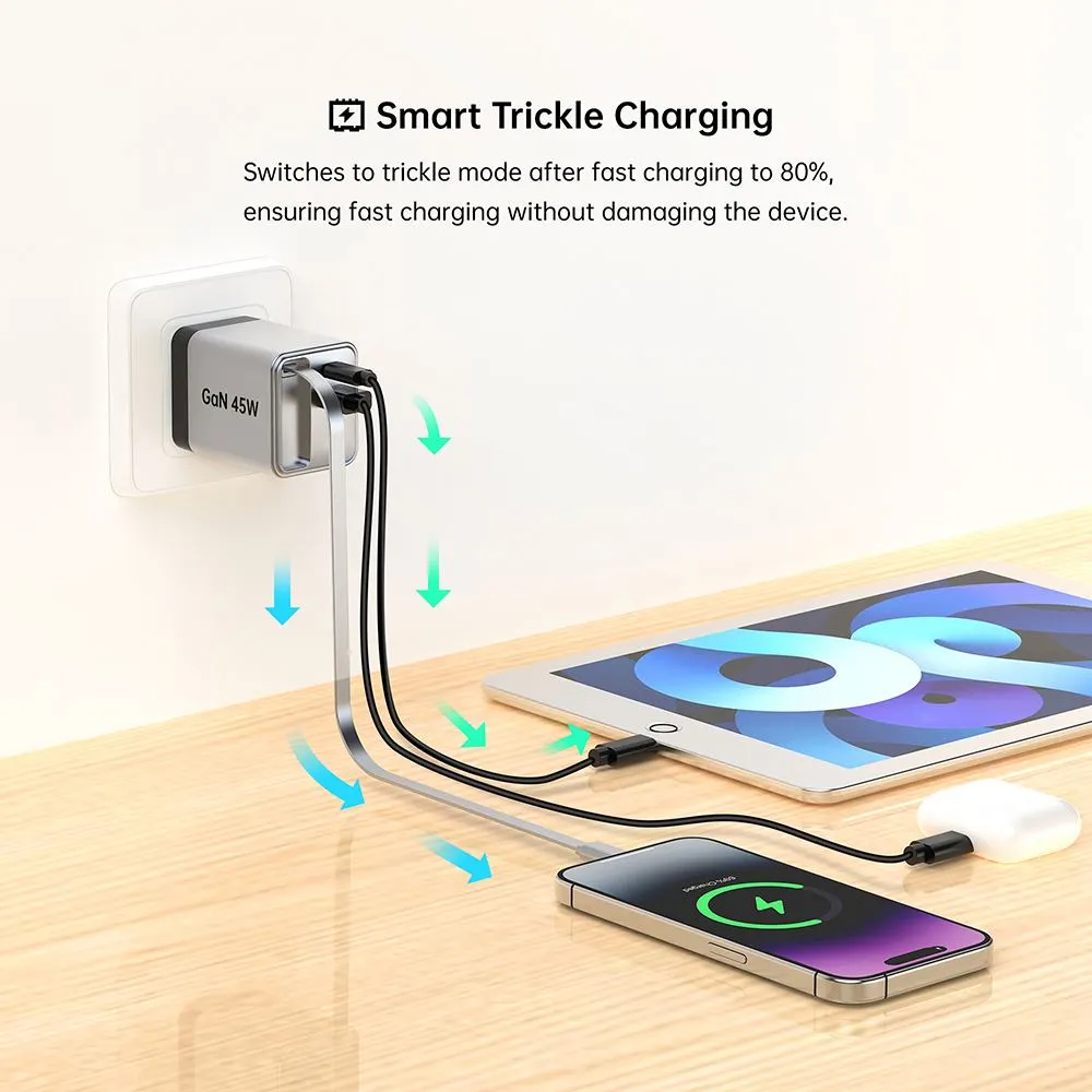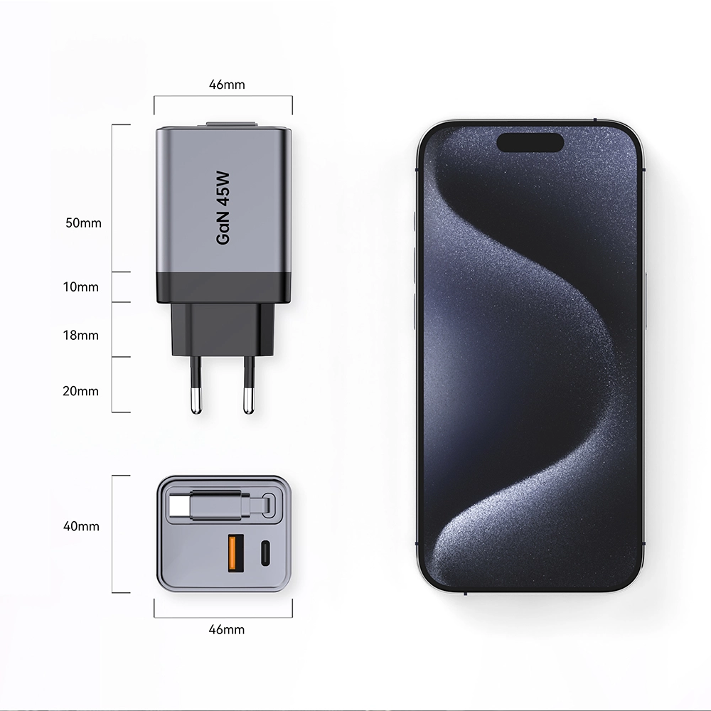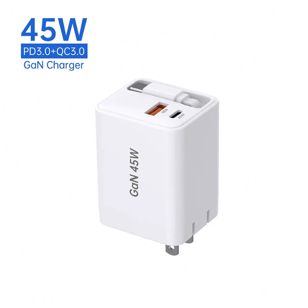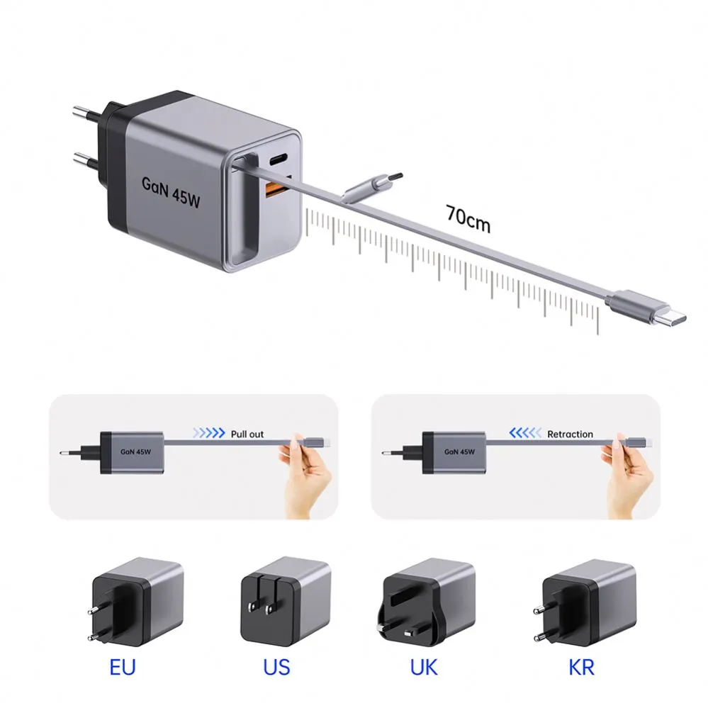 केबलसह GAN 45W मागे घेण्यायोग्य फास्ट चार्जर USB-CABLE+USB-A+USB-C 45W PD चार्जर