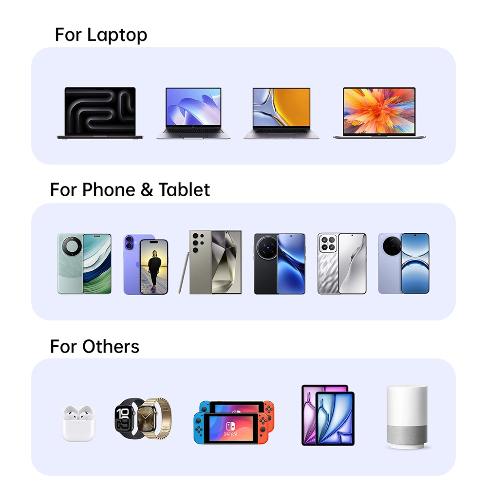 युनिव्हर्सल कंपॅटिबिलिटी: आमचा पीडी चार्जर पॉवर डिलिव्हरी (पीडी) तंत्रज्ञानाने सुसज्ज आहे, ज्यामुळे ते स्मार्टफोन, टॅब्लेट आणि काही विशिष्ट लॅपटॉपसह अनेक उपकरणांशी सुसंगत बनते. तुमच्या सर्व गॅझेट्ससाठी हे अंतिम चार्जिंग समाधान आहे.