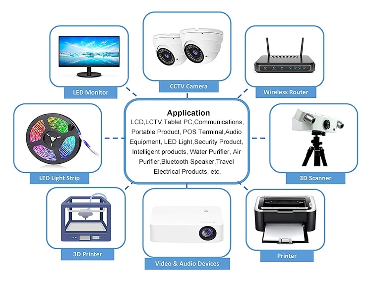 * 48W मालिकेसाठी अधिक युनिट्स: 5V/9V/12V/15V/19V/24V/36V/48V उपलब्ध * सुरक्षा: OCP/OVP/OTP, SCP, स्वयंचलित ओव्हरलोड कट-ऑफ, ओव्हरव्होल्टेज कट-ऑफ, स्वयंचलित थर्मल कट-ऑफ. * विस्तृत सुसंगतता: एलईडी स्ट्रिप लाइट्स, 3डी प्रिंटर, हॅम रेडिओ ट्रान्सीव्हर, सीसीटीव्ही कॅमेरे, कार सबवूफर अँप, ऑडिओ ॲम्प्लिफायर, वायरलेस राउटर, एडीएसएल कॅट्स, ह्युमिडिफायर, हब, कीबोर्ड, बीटी स्पीकर, मॉनिटर, वेबकॅम, डीव्हीआर, व्हिडिओ / पॉवर सप्लाय, एनव्ही