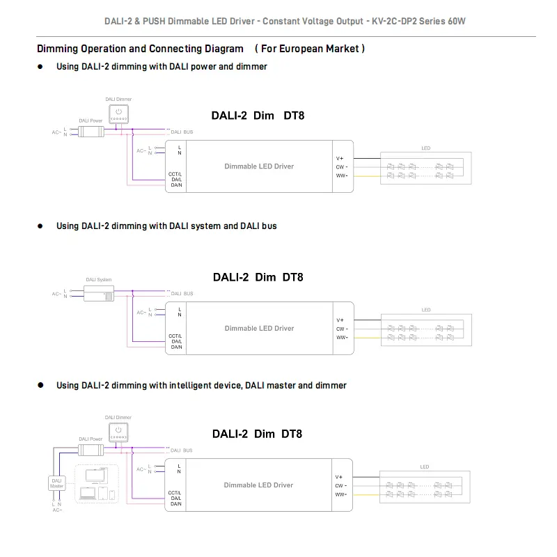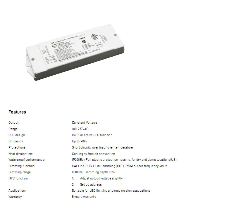 DALI डिजिटल डिमिंगचा अवलंब करून, ते 0.1%-100% गुळगुळीत फ्लिकर-फ्री डिमिंग आणि 2700K ते 6500K पर्यंत अचूक CCT ऍडजस्टमेंटचे समर्थन करते, रंग तापमान शिफ्ट दरम्यान ब्राइटनेस सुसंगत ठेवते. अंगभूत सक्रिय PFC कमी नो-लोड वीज वापरासह, 88% पर्यंत कार्यक्षमता वाढवते. यात सॉफ्ट स्टार्ट, ओव्हरव्होल्टेज, ओव्हरकरंट आणि शॉर्ट-सर्किट संरक्षण आहे, सुरक्षित ऑपरेशन सुनिश्चित करते.
