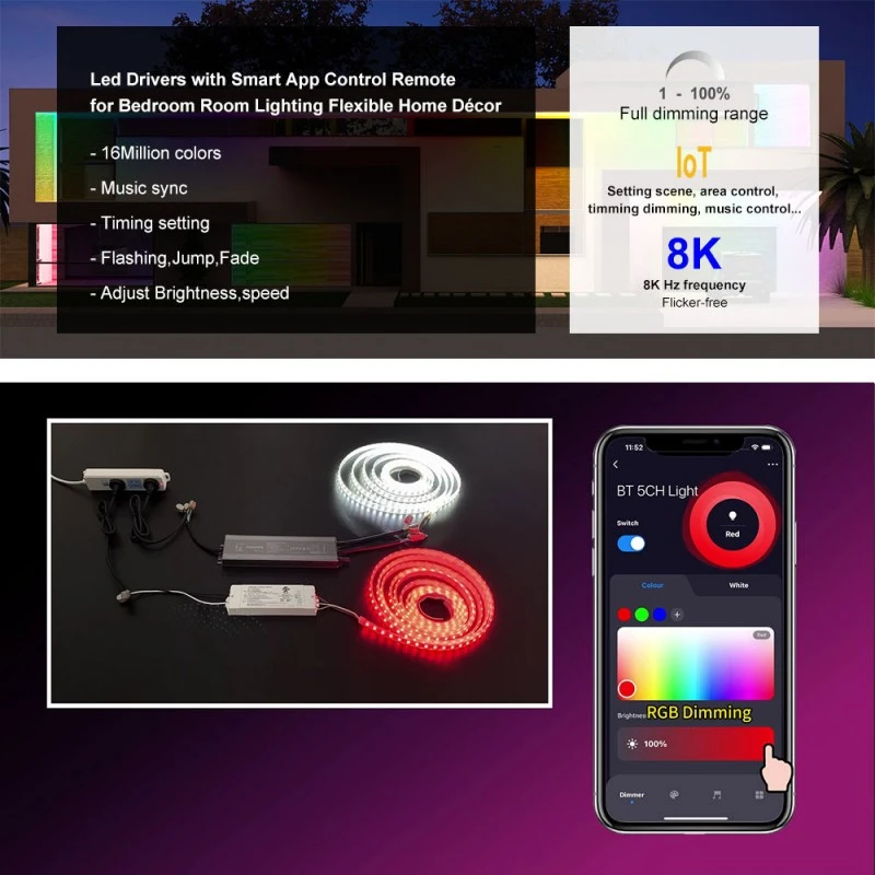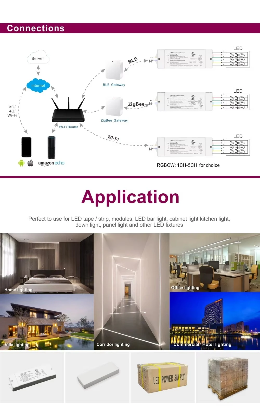 आपल्या बोटांच्या टोकावर स्मार्ट डिमिंग TUYA तंत्रज्ञानासह एकात्मिक ZigBee वायरलेस मॉड्यूलचे वैशिष्ट्य असलेले, हा ड्रायव्हर अखंड स्मार्ट कंट्रोल ऑफर करतो. Google Home आणि Amazon Echo द्वारे मोबाइल ॲप किंवा व्हॉइस कमांडद्वारे ब्राइटनेस समायोजित करा. उच्च-फ्रिक्वेंसी 8K Hz PWM आउटपुट पूर्णपणे फ्लिकर-फ्री डिमिंग सुनिश्चित करते, तर 1% खोलीसह 1-100% मंदीकरण श्रेणी गुळगुळीत संक्रमण आणि परिपूर्ण वातावरण निर्मितीसाठी अनुमती देते.