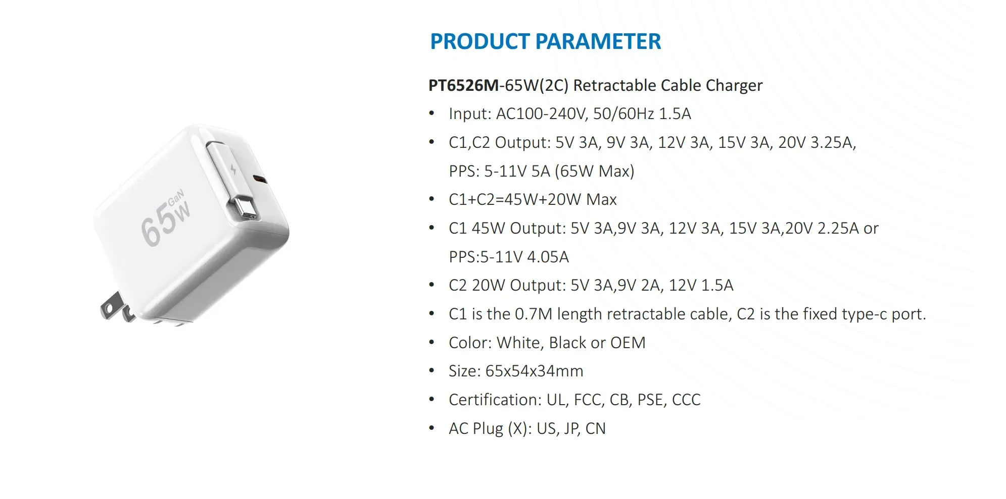 ट्रॅक्टेबल यूएसबी सी केबल स्पेसिफिकेशनसह 65W PD चार्जर: