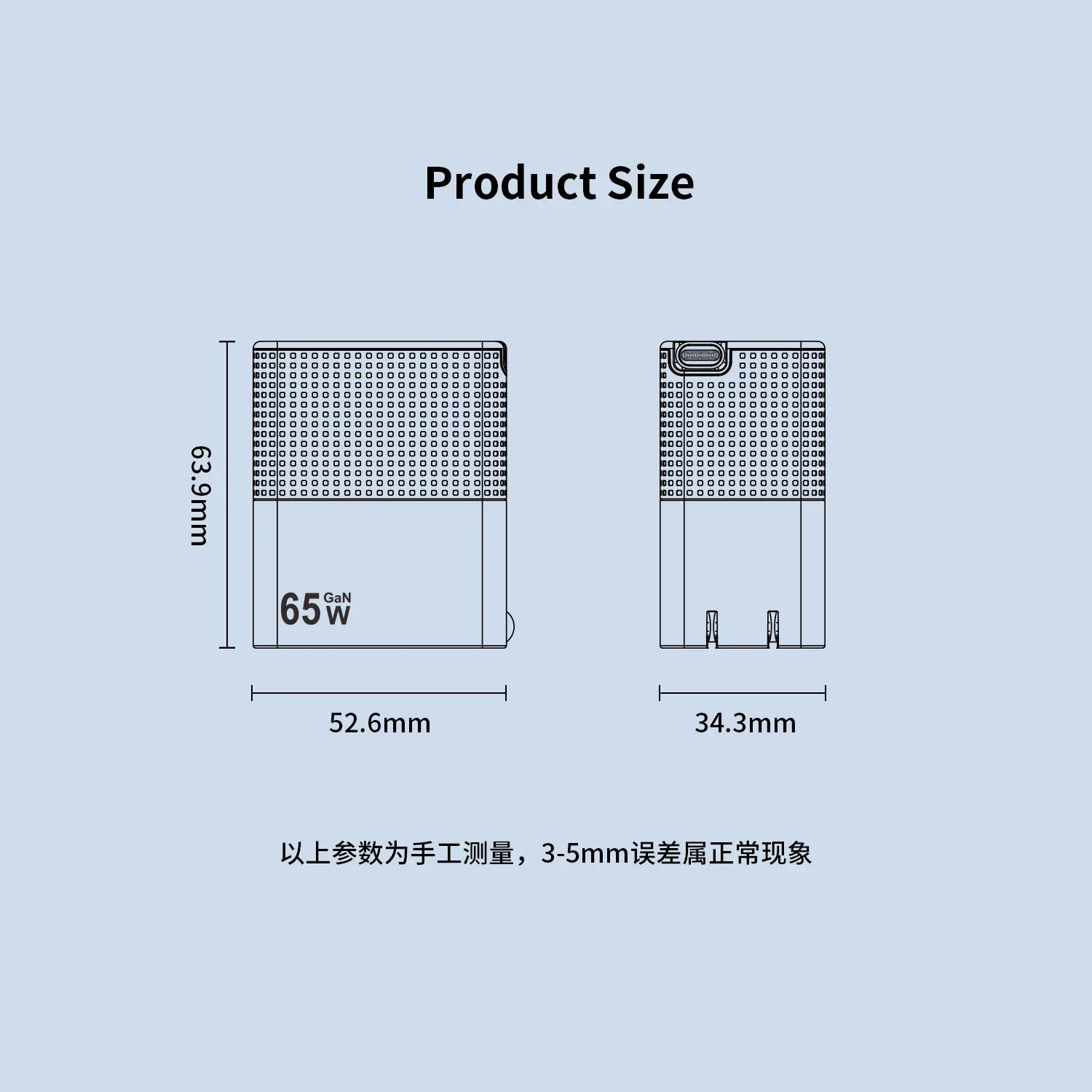 ड्युअल USB-C पोर्ट: 65W PD 3.0 चार्जर एकाच वेळी दोन उपकरणे चार्ज करू शकतो. दोन चार्जिंग प्रक्रियेदरम्यान, पॉवर 45W आणि 20W म्हणून वाटप केली जाते.