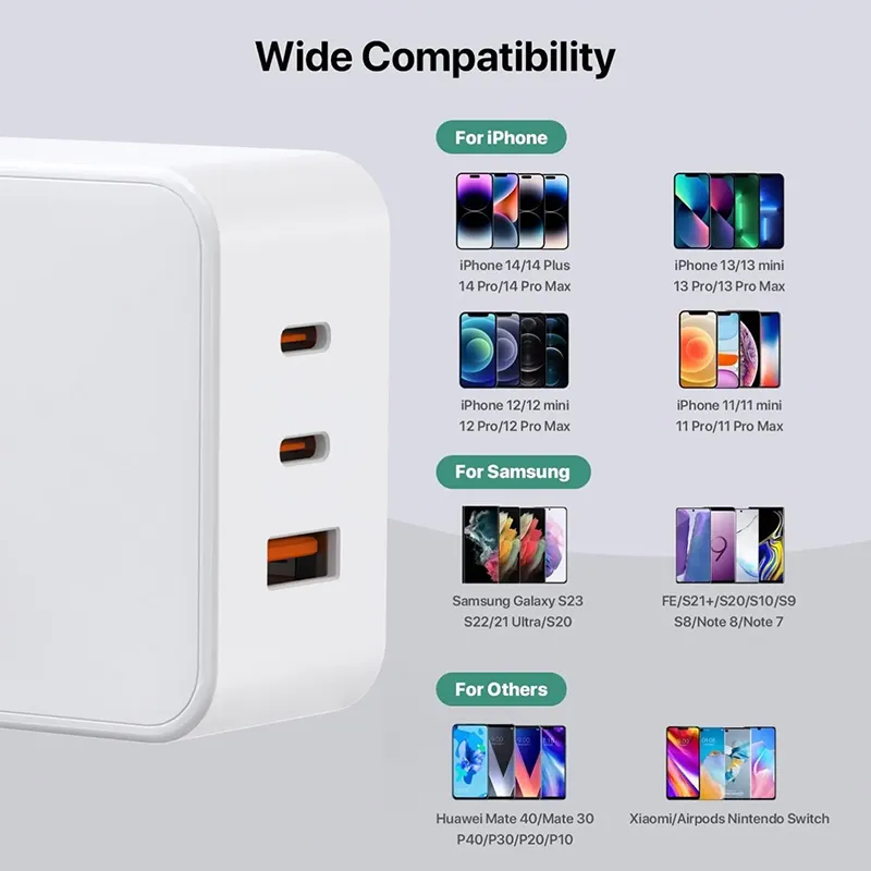 UK EU प्लगसह स्टारवेल उच्च दर्जाचा 65W PD चार्जर UK BS 1363 आणि EU CEE 7 प्लग दोन्ही वैशिष्ट्यीकृत करतो, युनायटेड किंगडम, युरोपियन युनियन आणि इतर प्रदेशांमध्ये या मानकांचा अवलंब करत अखंड वापर सक्षम करतो—कोणत्याही अतिरिक्त अडॅप्टरची आवश्यकता नाही.