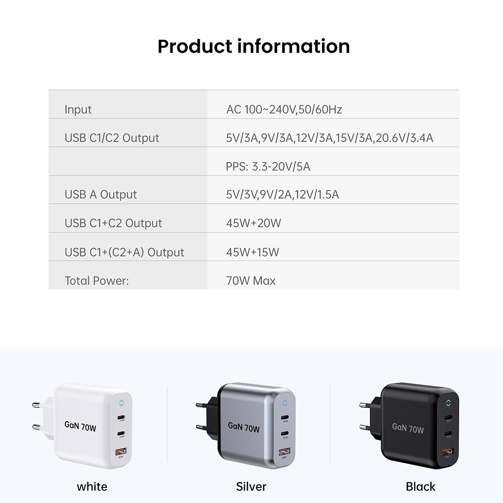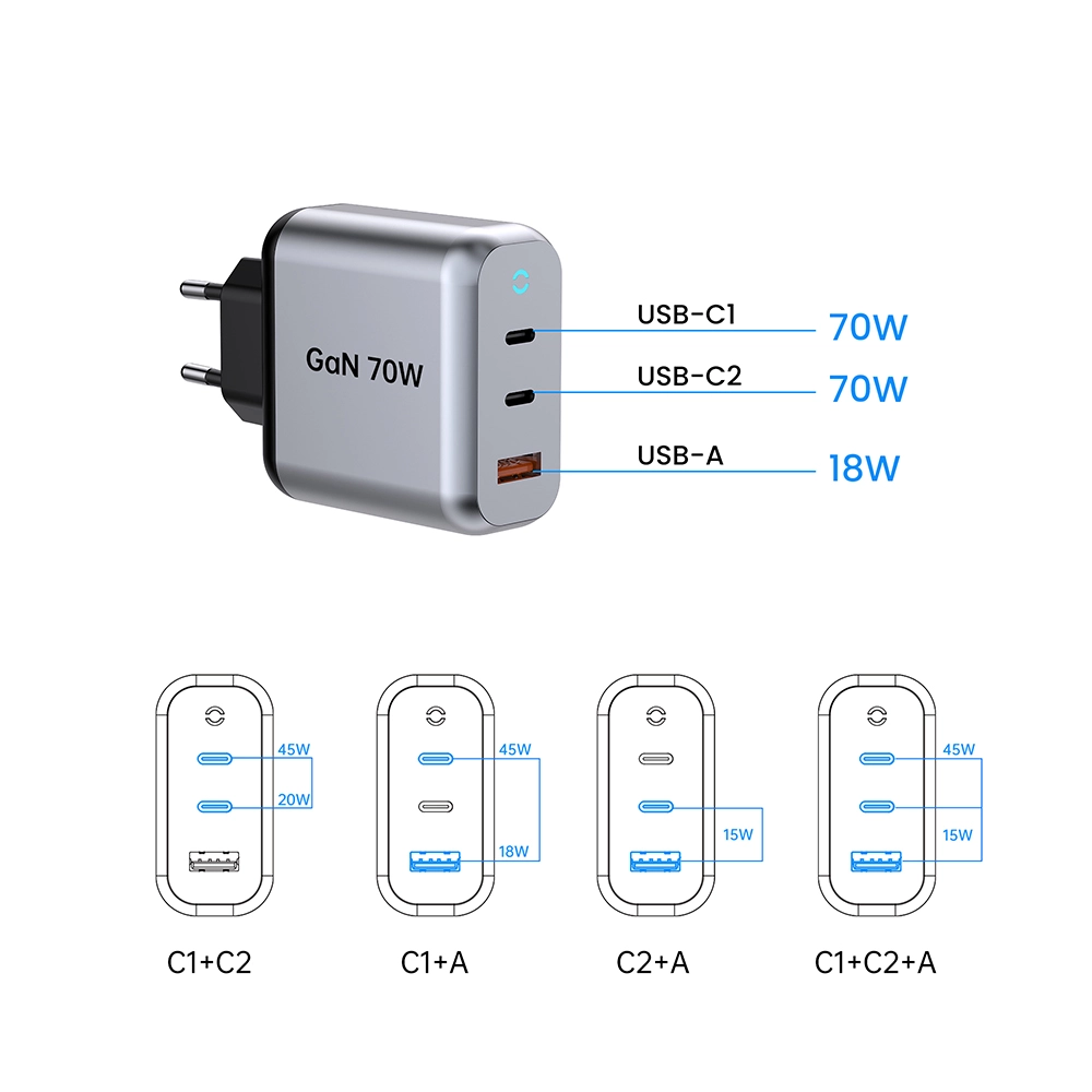 C1/C2 आउटपुट: 5V3A,9V3A,12V3A,15V3A,20.6V3.4A (70W कमाल) PPS: 3.3-11V 4.05A USB-A आउटपुट: 5V3A,9V2A,12V1.5A 3.3-11V 2A(22W कमाल) C1+C2 आउटपुट: 45W+20W C1+C2+USB-A आउटपुट: 45W+5V3A एकूण:70W |