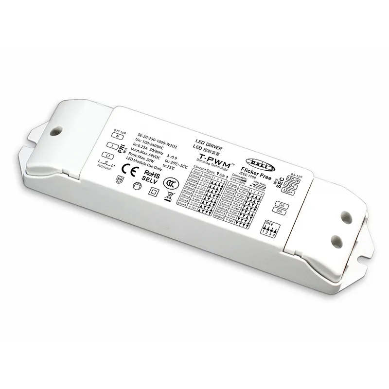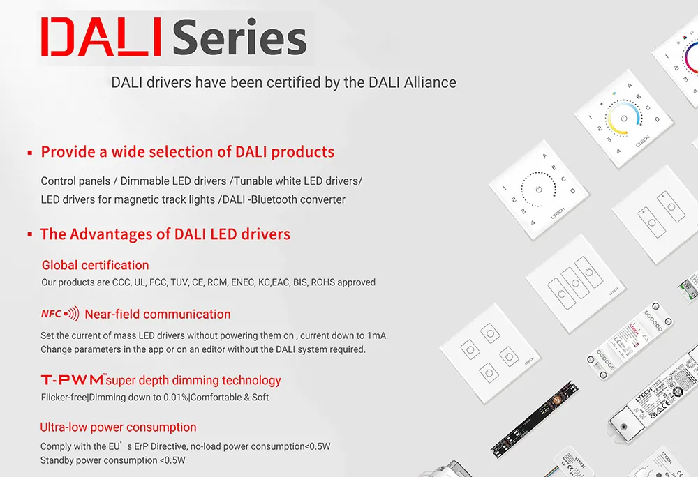 प्रगत DALI डिमिंग कंट्रोल - उच्च रिझोल्यूशनसह 0.1% ते 100% पर्यंत डिजिटल डिमिंग सक्षम करते, स्वयंचलित प्रकाश प्रणालीमध्ये वैयक्तिक किंवा गट नियंत्रणासाठी 64 DALI पत्त्यांपर्यंत समर्थन देते.