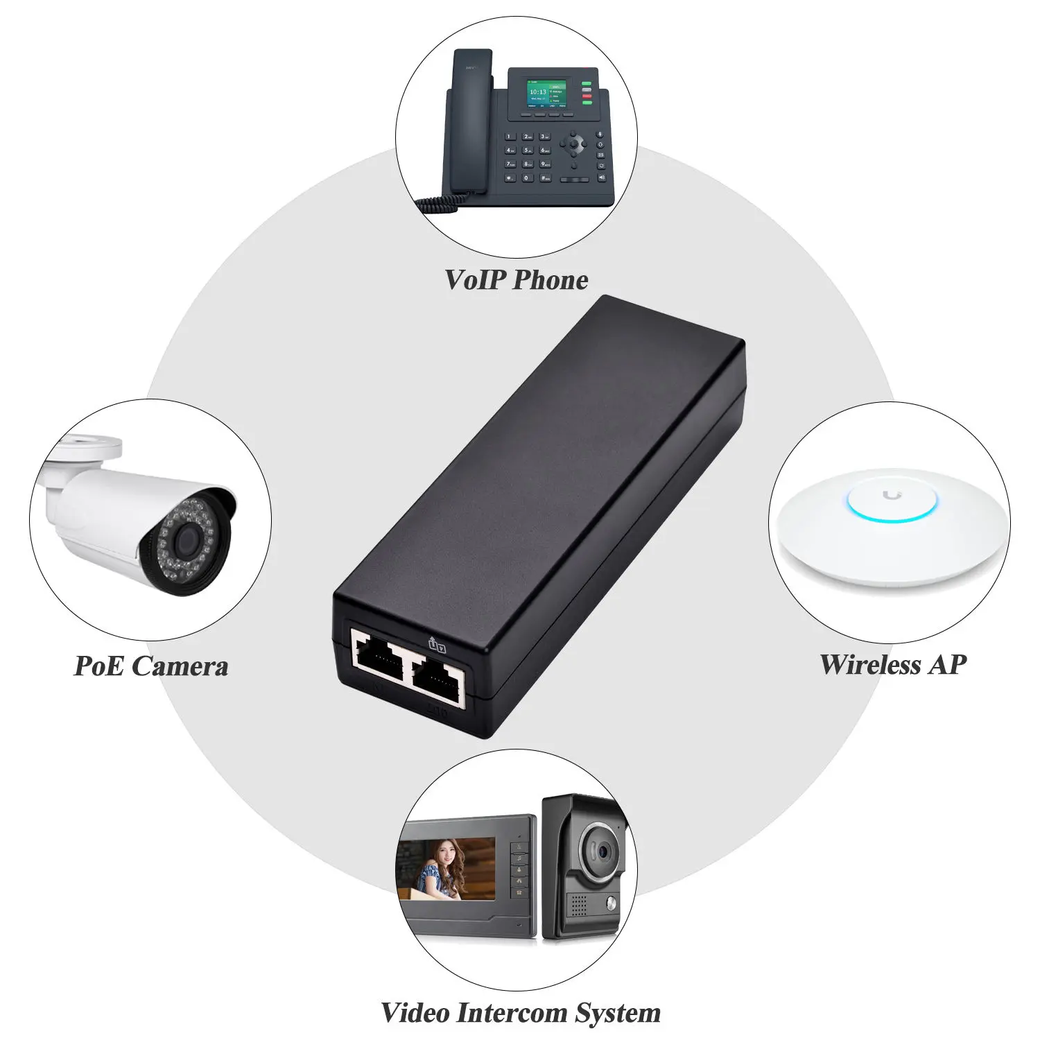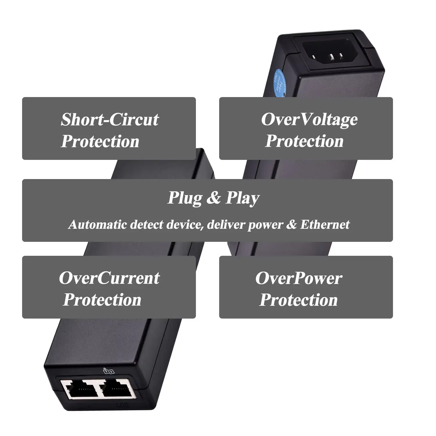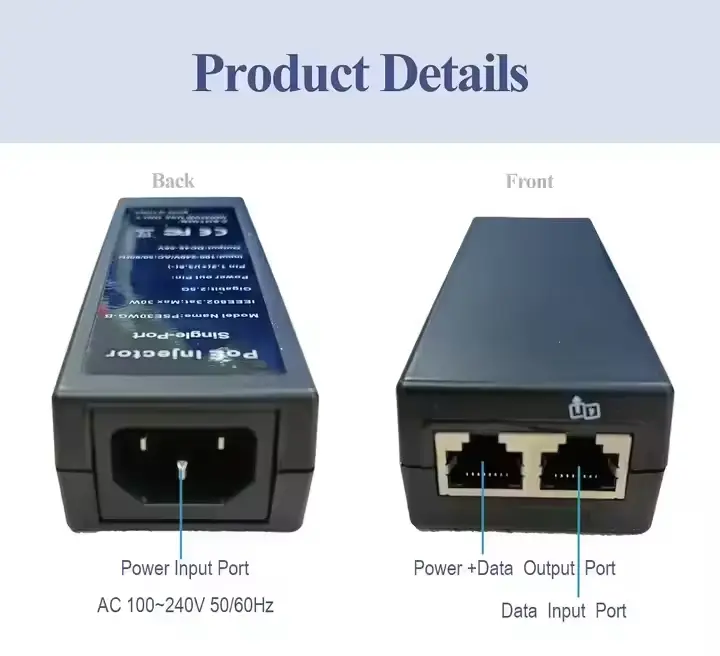 हाय पॉवर आउटपुट: 30W पर्यंत आउटपुटला सपोर्ट करते, IP कॅमेरे, वायरलेस APs आणि VoIP फोन सारख्या नेटवर्क उपकरणांना कार्यक्षमतेने पॉवरिंग आणि कनेक्ट करते.