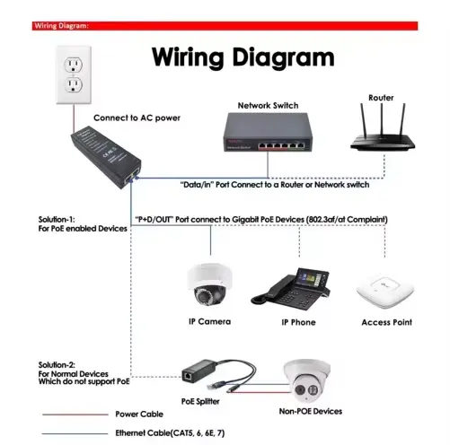 पॉवर आणि डेटा इंटिग्रेशन: एका इथरनेट केबलवर स्थिर 48V पॉवर आणि पूर्ण 1000Mbps डेटा वितरित करते, क्लिनर डिप्लॉयमेंटसाठी अतिरिक्त वायरिंग आणि पॉवर आउटलेट काढून टाकते.
