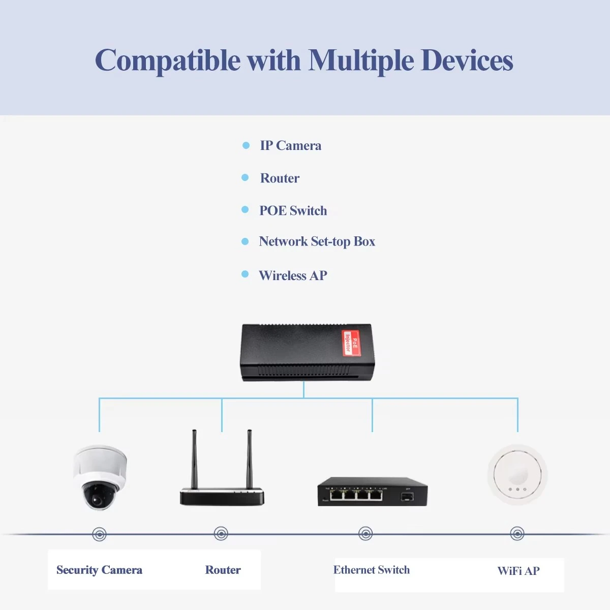 वायरलेस ऍक्सेस पॉइंट्स, PTZ IP कॅमेरे आणि व्हिडीओफोन्स सारख्या उपकरणांना रिमोट पॉवर पुरवठा करते