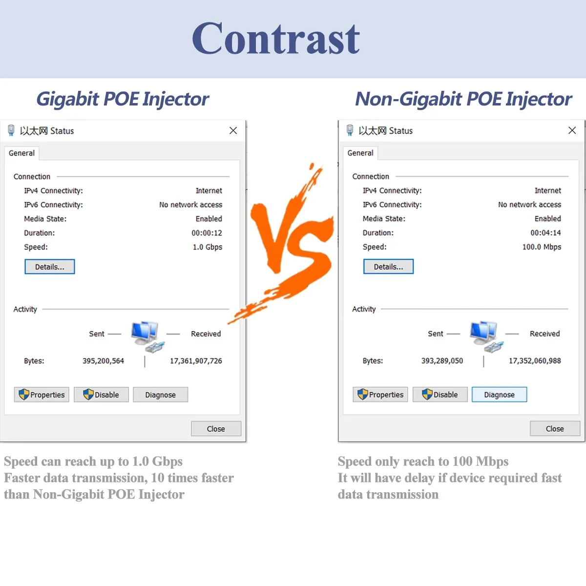 * IEEE 802.3bt मानकांतर्गत, उर्जा प्रक्रिया दोन मूलभूत श्रेणींमध्ये विभागली गेली आहे "टाइप 3" आणि "टाइप 4" थोडक्यात, टाइप 3 ची पॉवर आवश्यकता 60W इतकी जास्त आहे आणि टाइप 4 ची उर्जा 90W इतकी जास्त आहे.