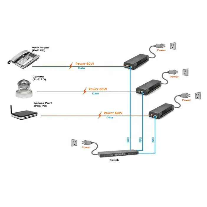 60W पर्यंतचे आउटपुट वितरित करते आणि IEEE 802.3bt/at/af मानकांना पूर्णपणे समर्थन देते. हे लो-पॉवर उपकरणे (15.4W) आणि उच्च-शक्ती उपकरणे (30W/60W) या दोन्हींना शक्ती देते, जवळजवळ सर्व इथरनेट-चालित उपकरणे कव्हर करते आणि मजबूत PoE सुसंगतता सुनिश्चित करते.