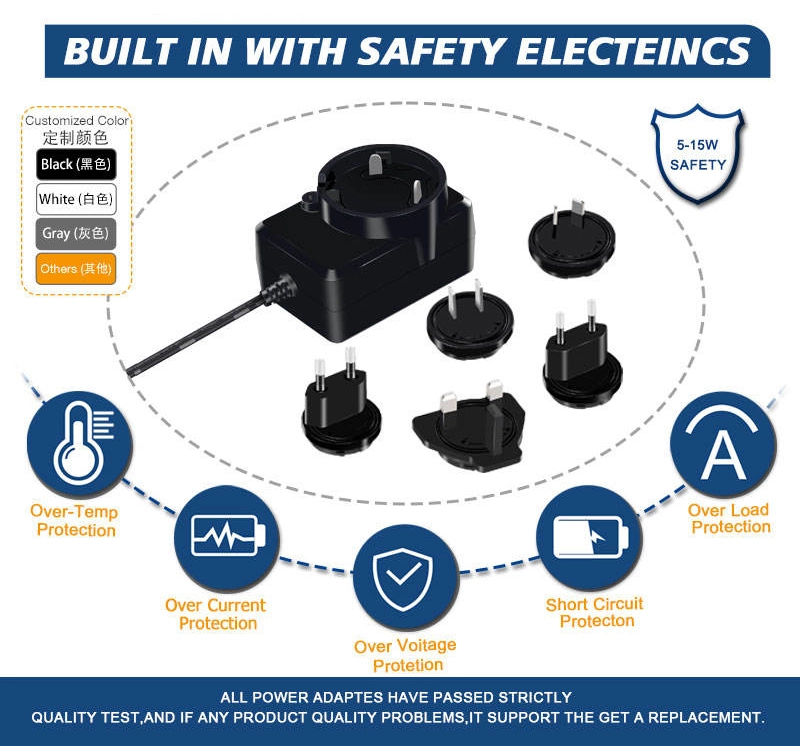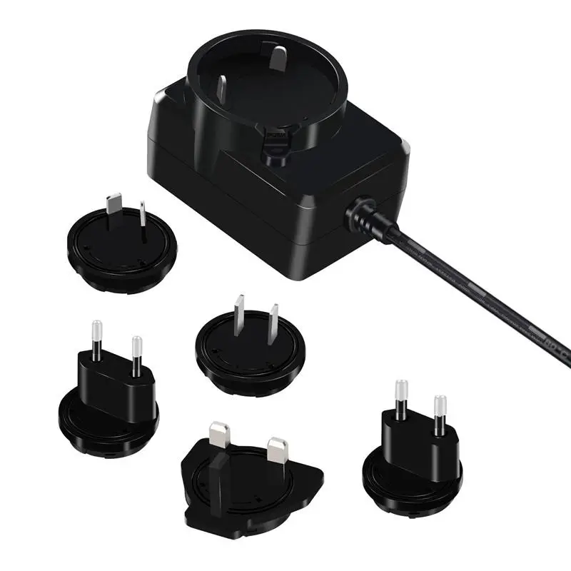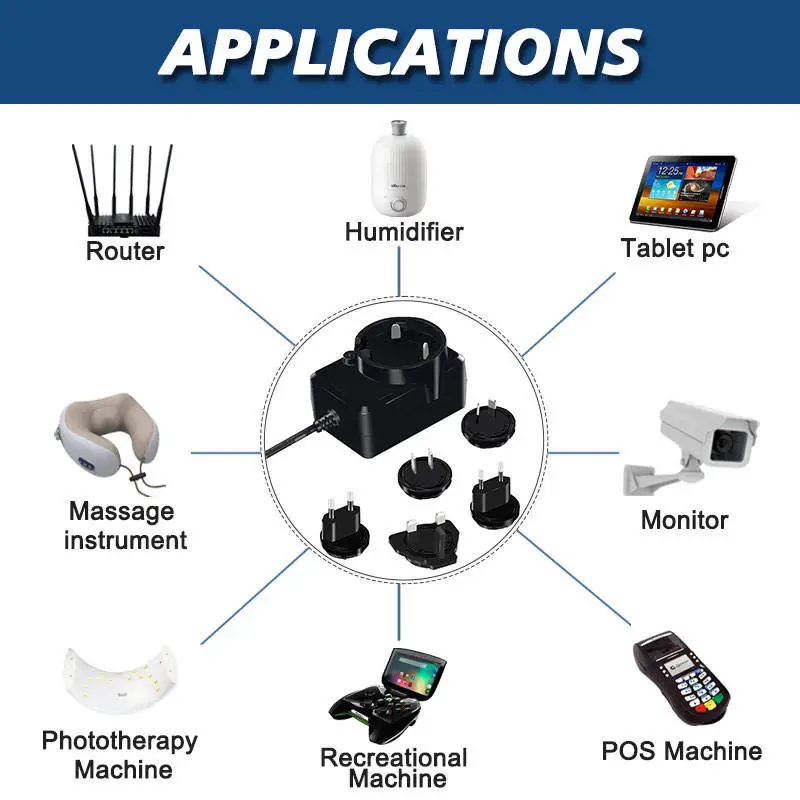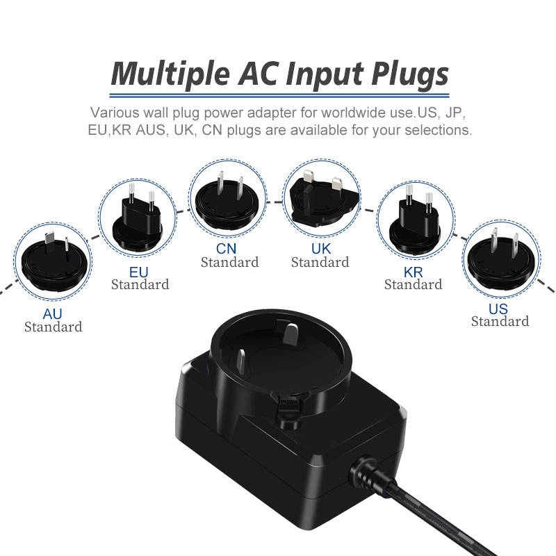 स्टारवेल उच्च दर्जाचे अदलाबदल करण्यायोग्य प्लग पॉवर सप्लाय ॲडॉप्टर हे एक बहुमुखी आणि पोर्टेबल डिव्हाइस आहे जे वॉल आउटलेटमधून AC (अल्टरनेटिंग करंट) मेन विजेचे रूपांतर स्थिर, लो-व्होल्टेज डीसी (डायरेक्ट करंट) पॉवरमध्ये करण्यासाठी डिझाइन केलेले आहे जे इलेक्ट्रॉनिक उपकरणांच्या विस्तृत श्रेणीसाठी आवश्यक आहे. त्याचे परिभाषित वैशिष्ट्य म्हणजे विलग करण्यायोग्य आणि अदलाबदल करण्यायोग्य प्लगचा संच (बहुतेकदा "AC प्लग" किंवा "इनपुट ब्लेड" असे म्हणतात) जे विविध आंतरराष्ट्रीय सॉकेट मानकांशी सुसंगत असतात.