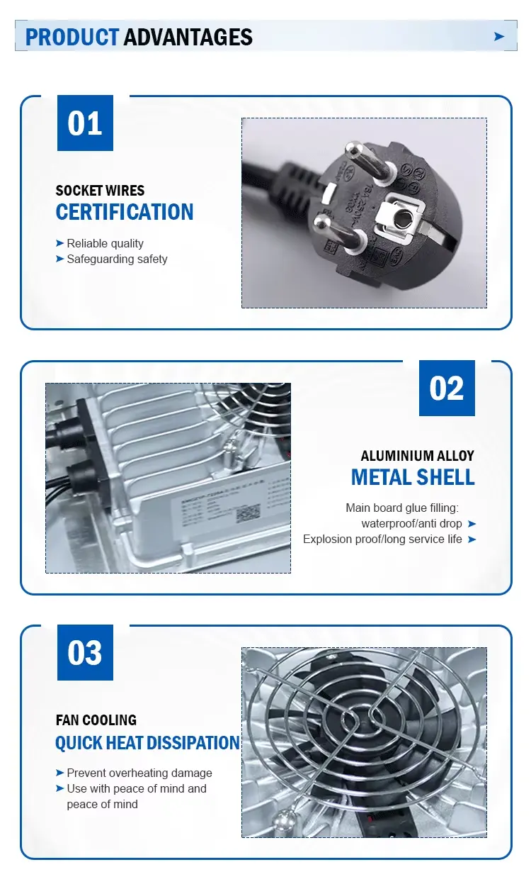 उच्च कार्यक्षमता आणि स्मार्ट संरक्षण: 93% पर्यंत कार्यक्षमता आणि ≥0.98 पॉवर फॅक्टर प्राप्त करून, हे चार्जर उर्जेचे नुकसान कमी करते आणि ऑपरेटिंग खर्च कमी करते. अंगभूत संरक्षणांमध्ये ओव्हर-व्होल्टेज, शॉर्ट सर्किट, रिव्हर्स पोलॅरिटी आणि अति-तापमान सुरक्षितता यांचा समावेश होतो. LED इंडिकेटर एका दृष्टीक्षेपात स्पष्ट चार्जिंग स्थिती प्रदान करतो.