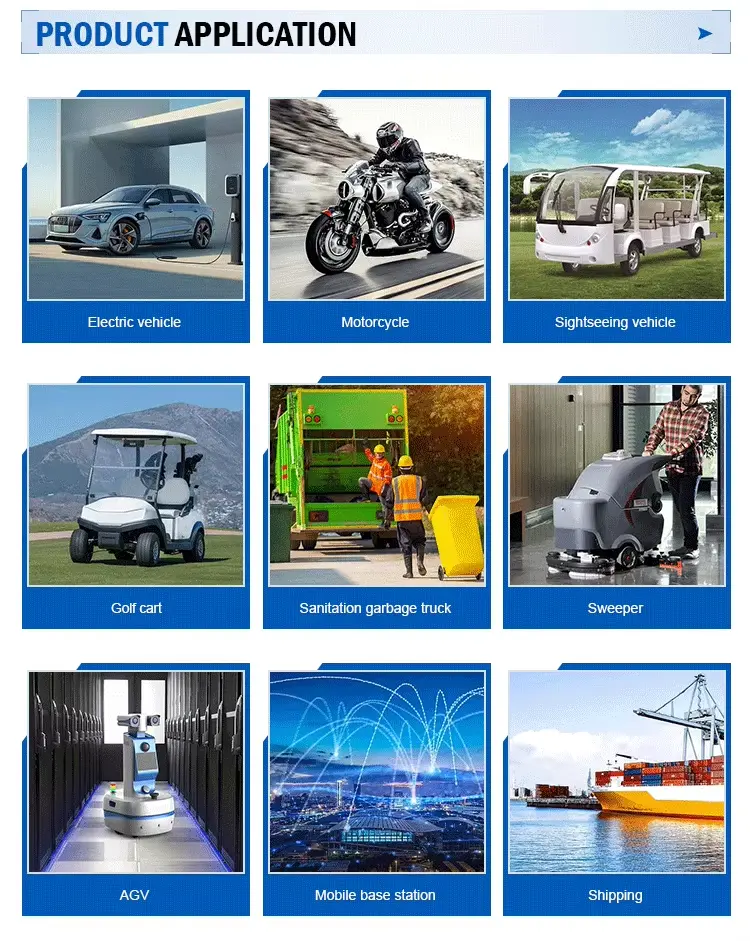 वापर: मोटारसायकल/स्कूटर, ट्रायसायकल, क्रॉपर, स्वीपर, फोर्कलिफ्ट, ट्रक, इलेक्ट्रिक बस, लीड-ऍसिड बॅटरी, इलेक्ट्रिक वाहन, प्रेक्षणीय स्थळे पाहण्याचे वाहन, लॉजिस्टिक वाहन, स्वच्छता वाहन, गस्ती कार, ढिगारा बग्गी, जहाज, दळणवळण उपकरणे