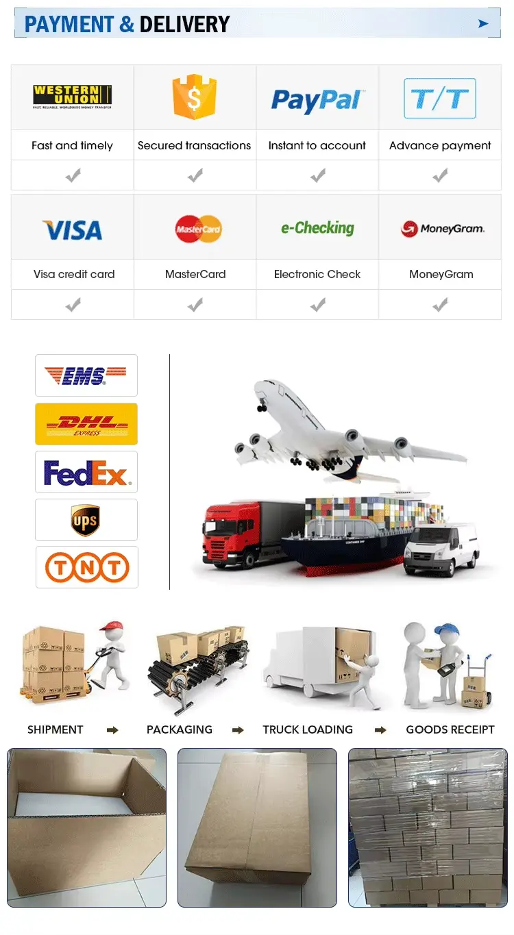 A4: एक्सप्रेसद्वारे लहान ऑर्डर पाठवल्या जातात (FEDEX, DHL, EMS, TNT). मोठ्या ऑर्डर समुद्र किंवा हवाई मार्गे जहाज. एफओबी किंमत उपलब्ध. तुम्ही तुमचा किंवा आमचा फॉरवर्डर वापरू शकता.