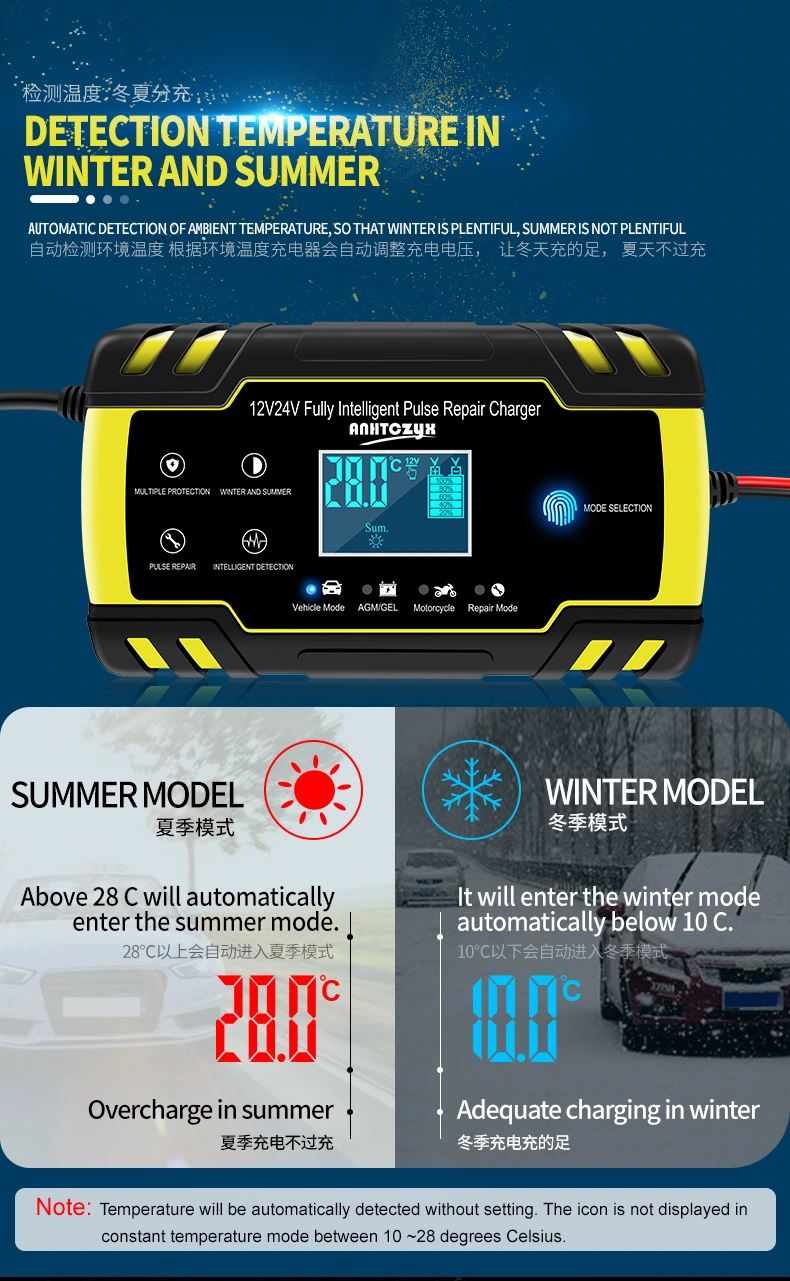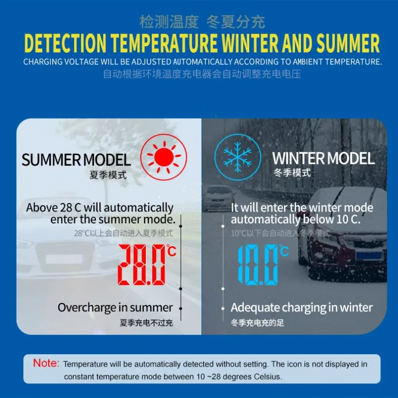 · ऑटो मेंटेनन्स मोड: ट्रिकल चार्जर आणि दीर्घकालीन बॅटरी मेंटेनर म्हणून कार्य करते, हंगामी किंवा वारंवार वापरल्या जाणाऱ्या वाहनांसाठी आदर्श.
