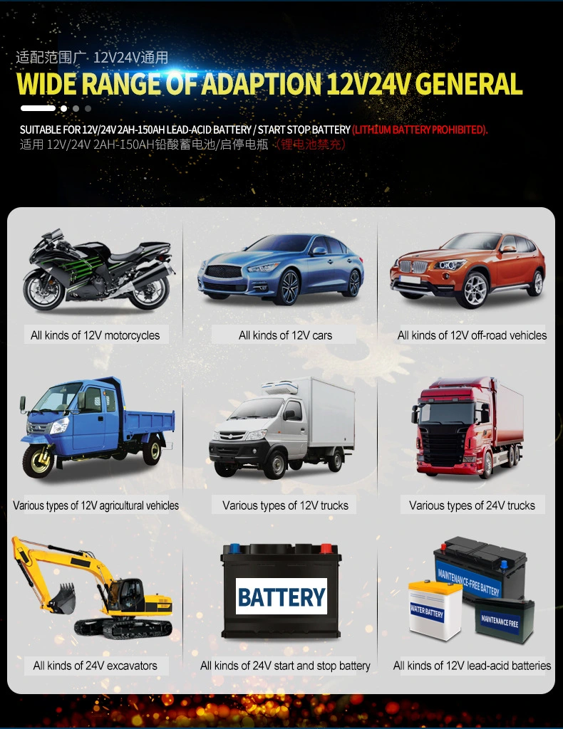 मोटारसायकल, कार, ट्रक; वाहन; AGM/GEL/WET/लीड-ऍसिड बॅटरी |
