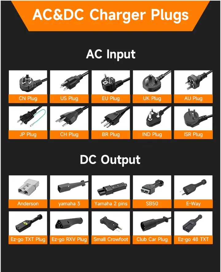 EU प्लग, सामान्यतः EU देशांसाठी जसे की जर्मनी, फ्रान्स, नेदरलँड्स, डेन्मार्क, ऑस्ट्रिया, स्वीडन इ. UK प्लग, सहसा ब्रिटन, भारत, पाकिस्तान, सिंगापूर आणि इ. AU प्लग, सहसा ऑस्ट्रेलिया, न्यूझीलंड, अर्जेंटिना आणि इ. मार्केटमधील सामान्य डीसी कनेक्टरमध्ये अँडरसन, ईझेड-गो, डीएस क्लब कार आणि यामाहा कनेक्टर इत्यादींचा समावेश आहे.