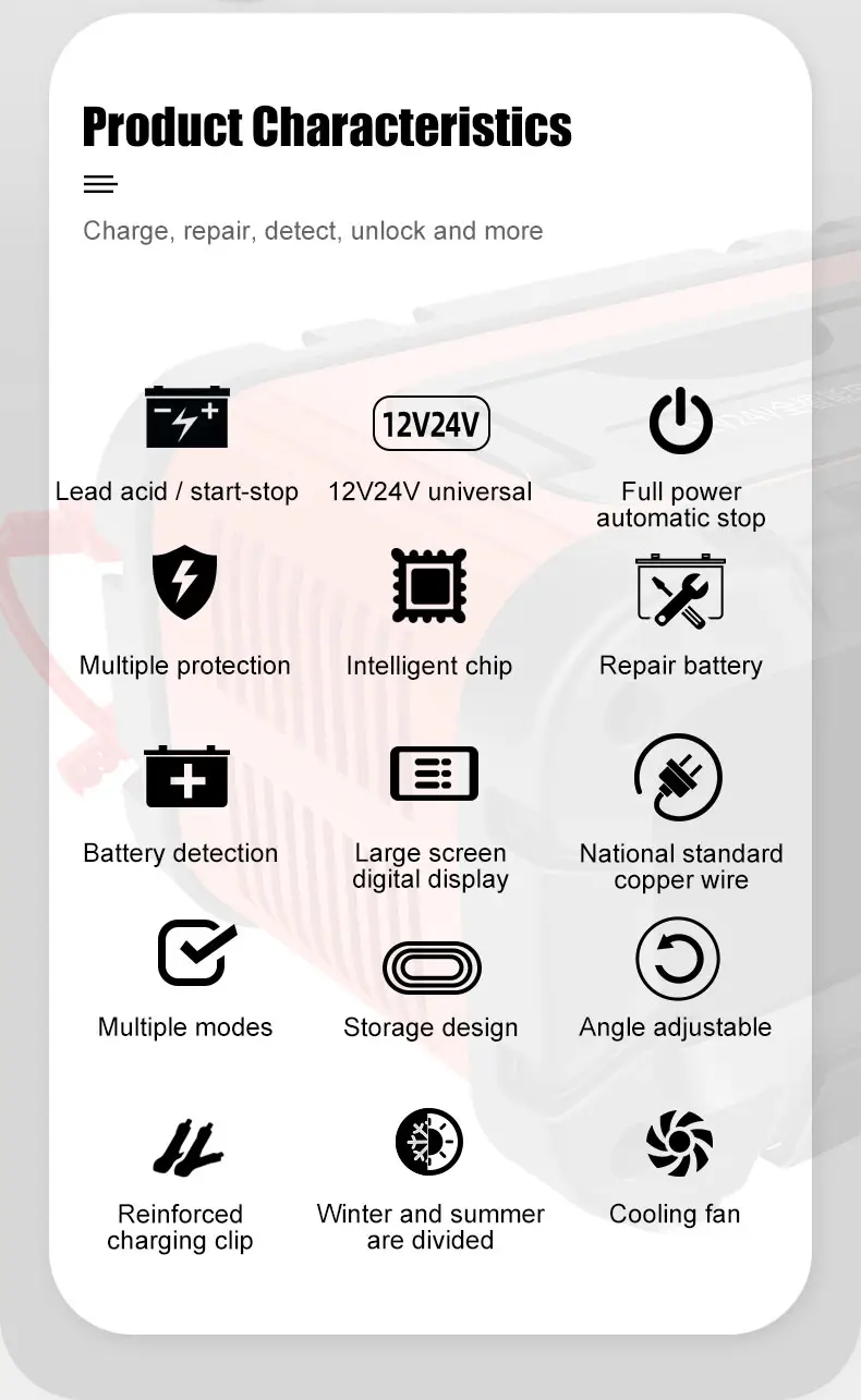 · ड्युअल बॅटरी सुसंगतता: अष्टपैलू ऍप्लिकेशन्ससाठी लीड ऍसिड (AGM, GEL, WET, MF, EFB) आणि LiFePO4 दोन्ही बॅटरियांना सपोर्ट करते
