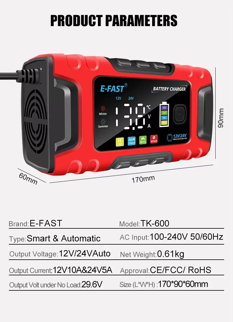 कारसाठी पल्स रिपेअर टेक्नॉलॉजी 12V10A 24V5A लीड ॲसिड लाईफपो4 बॅटरी चार्जरसह उच्च-गुणवत्तेचे ई-फास्ट TK-600 पूर्णपणे स्वयंचलित |