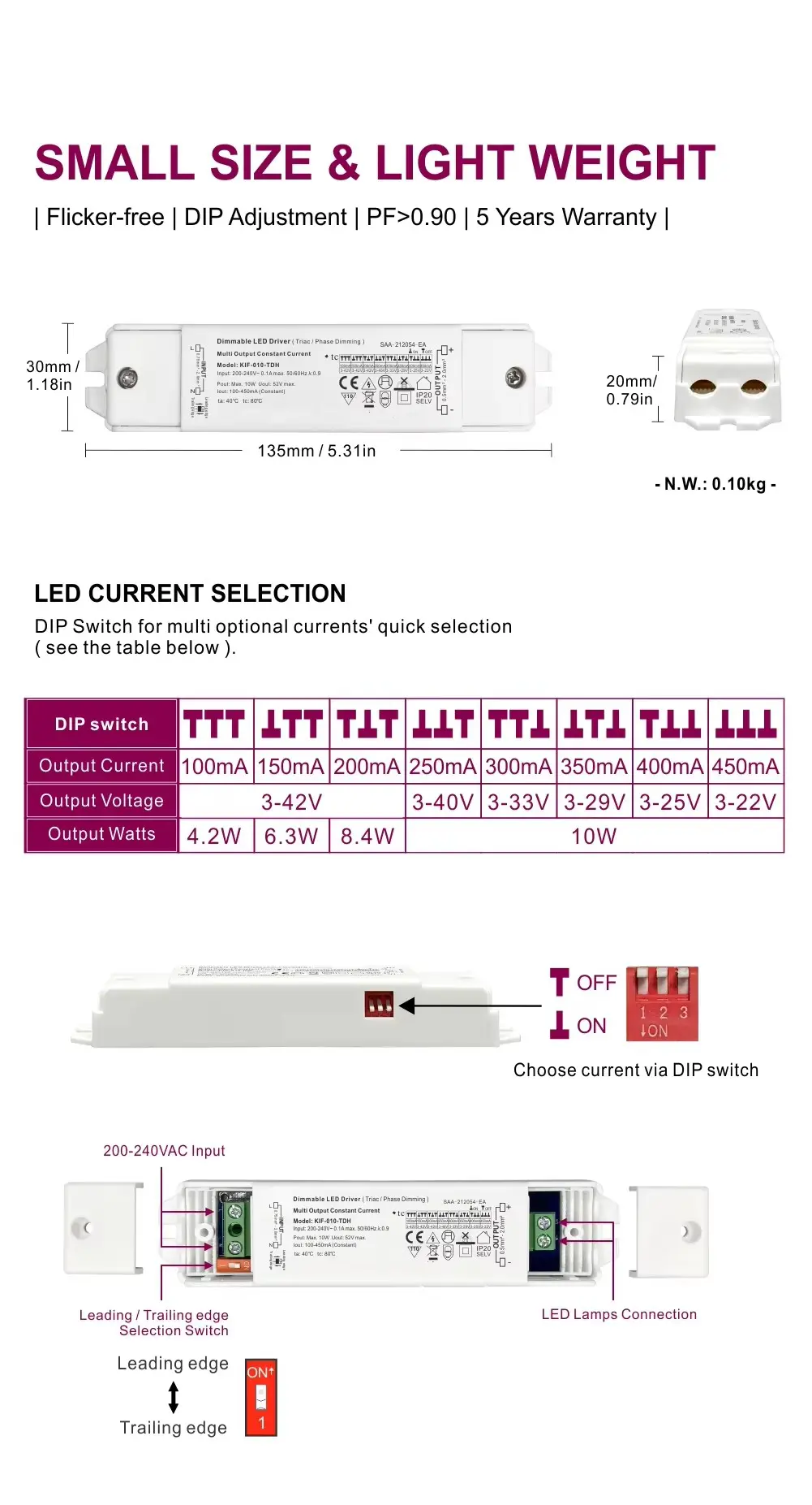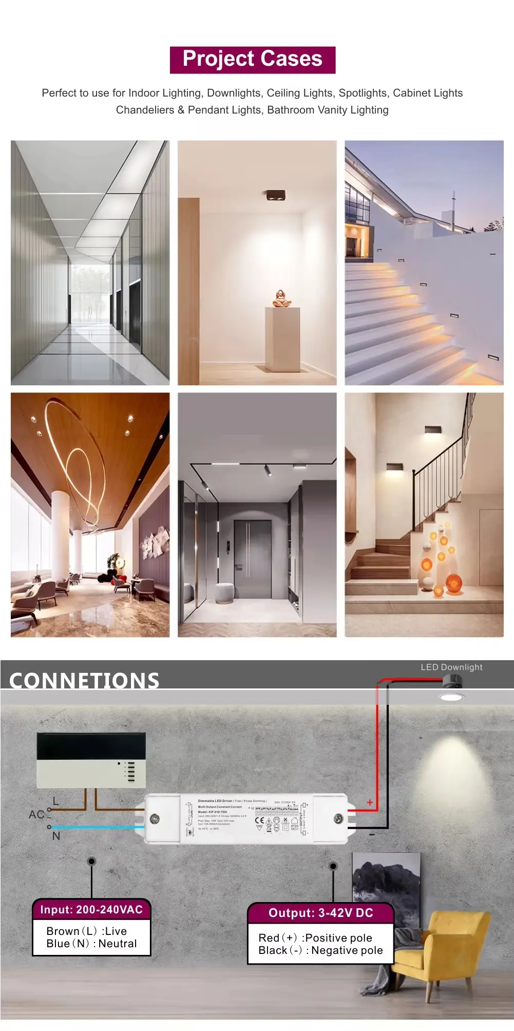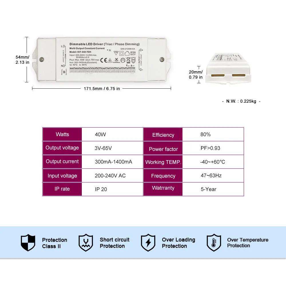 मजबूत पॉवर आणि उच्च कार्यक्षमता: हाय पॉवर फॅक्टर करेक्शन (PF>0.9) आणि कमी टोटल हार्मोनिक डिस्टॉर्शन (THD) सह, आमचा ड्रायव्हर जागतिक ऊर्जा कार्यक्षमतेच्या आवश्यकता पूर्ण करतो, तुमच्या इलेक्ट्रिकल सिस्टमवरील भार कमी करतो आणि मस्त, विश्वासार्ह कार्यक्षमतेसह ऑपरेट करतो.